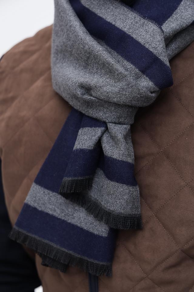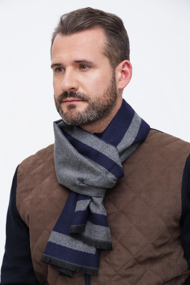 Этот стильный мужской шарф от Pezzo станет отличным дополнением к вашему гардеробу. Шарф выполнен в сочетании темно-синего и серого цветов, оформлен в классическую полоску.