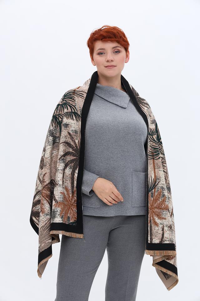 Этот шарф от бренда Pezzo – идеальный аксессуар для создания яркого и запоминающегося образа. Шарф выполнен в бежевых тонах и украшен эффектным тропическим принтом с изображением пальмовых листьев.
