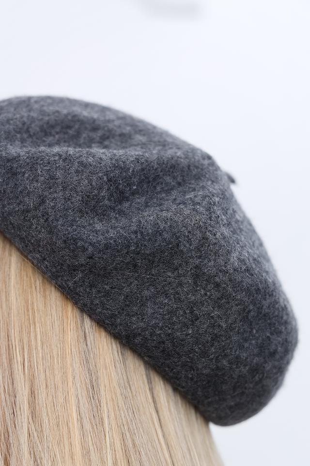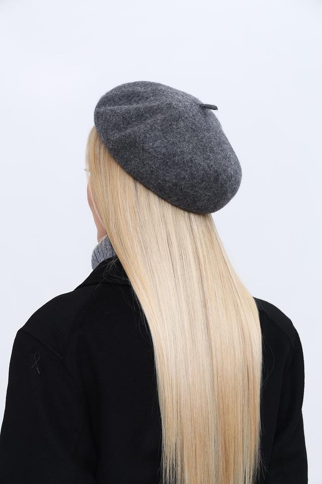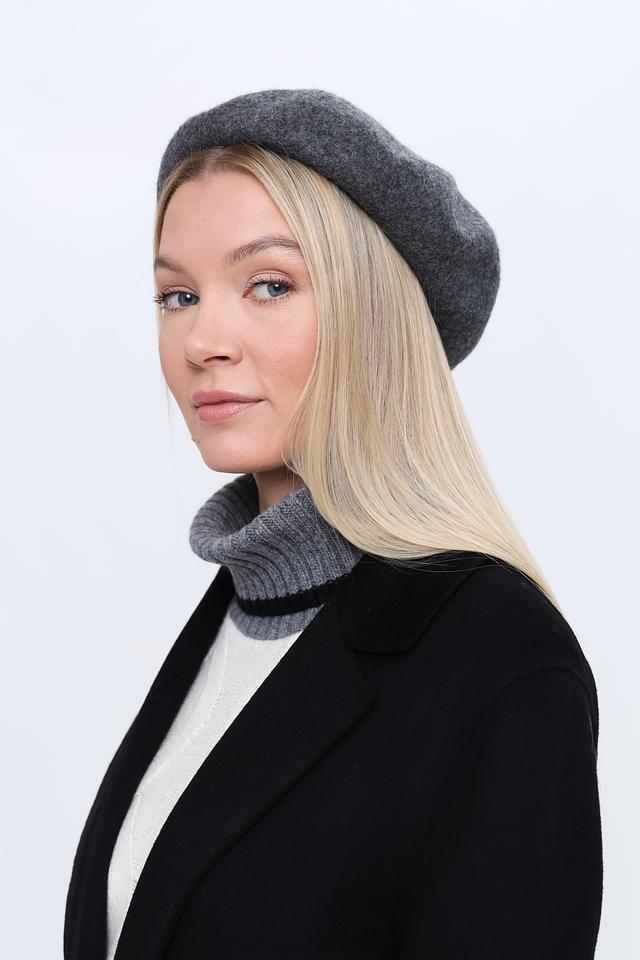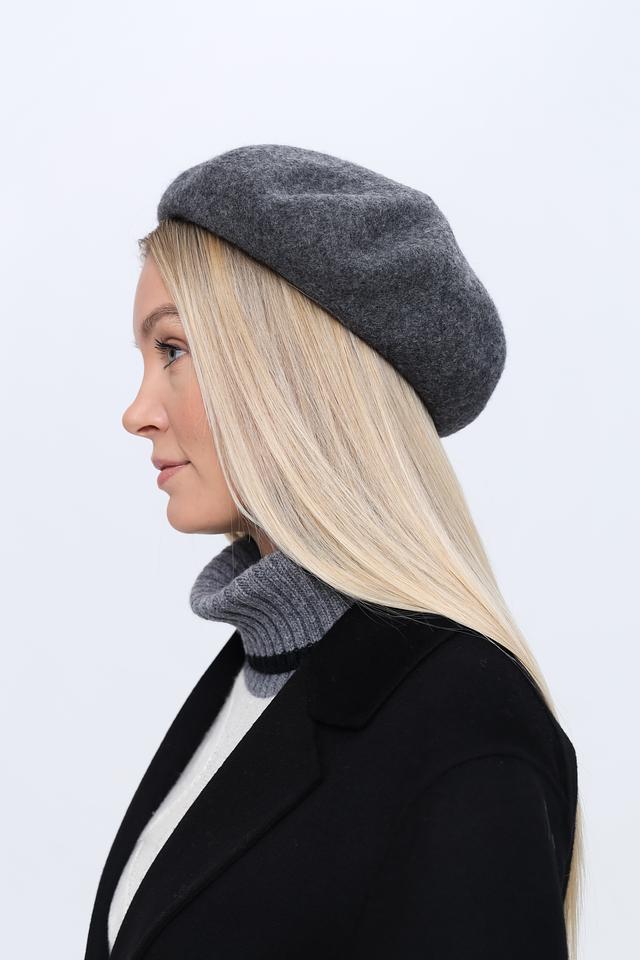 Берет имеет серый цвет, который легко сочетается с различными оттенками одежды. Он изготовлен из 90% шерсти и 10% нейлона, что обеспечивает мягкость, тепло и долговечность изделия.