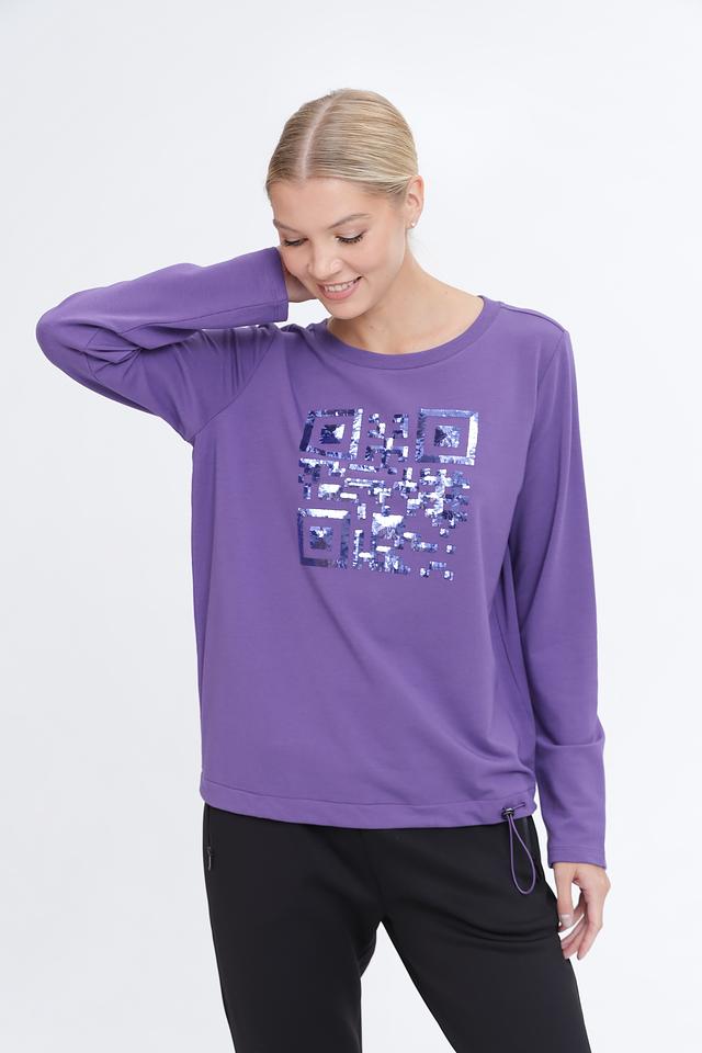 Женский пуловер Pezzo фиолетового цвета с оригинальным принтом на лицевой стороне. Изготовлен из мягкого и приятного к телу сочетания хлопка, модала и эластана, обеспечивающего комфорт при носке. Состав: хлопок 47%, модал 47%, эластан 6%