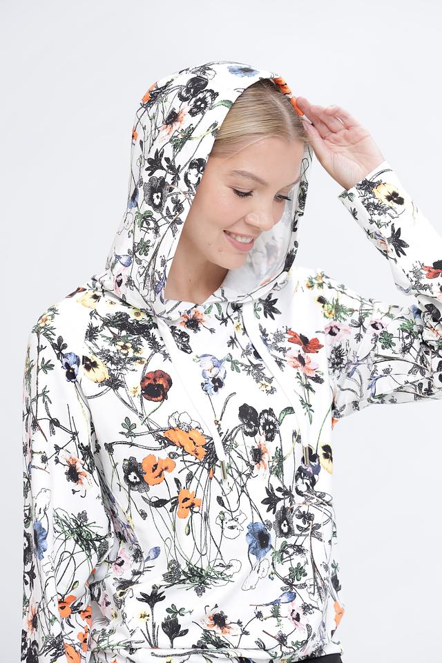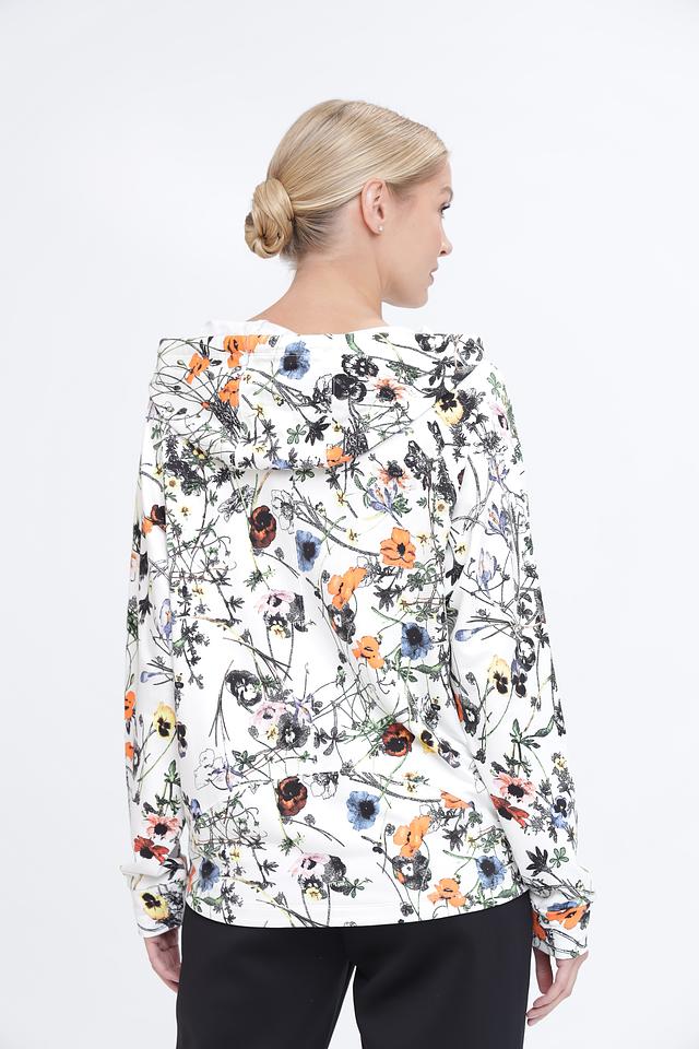 Женский пуловер Pezzo белого цвета с ярким цветочным принтом – стильное и комфортное решение для повседневного образа. Модель с капюшоном и длинными рукавами выполнена из мягкого и приятного к телу сочетания хлопка, модала и эластана. Состав: хлопок 50%, модал 45%, эластан 5%