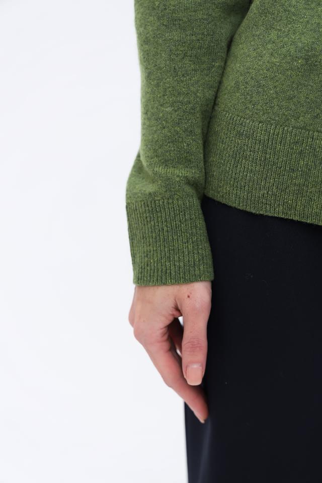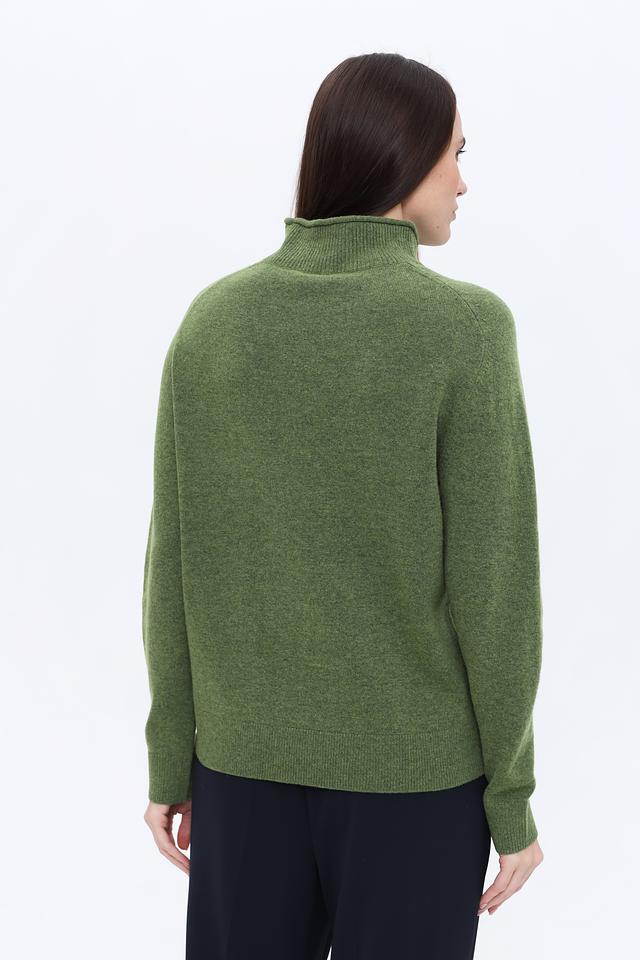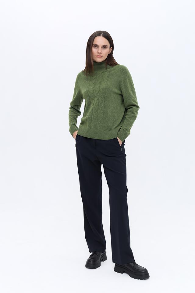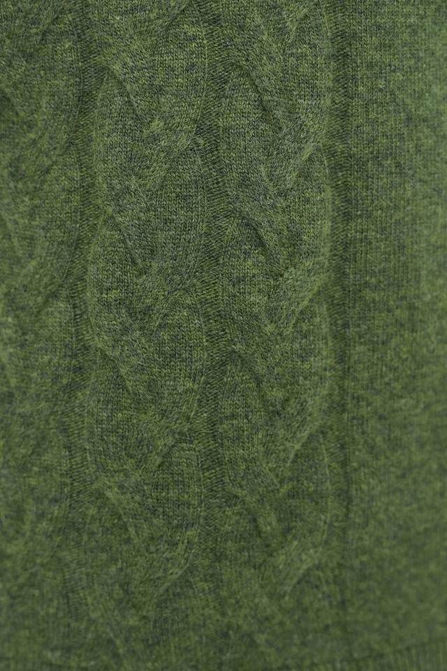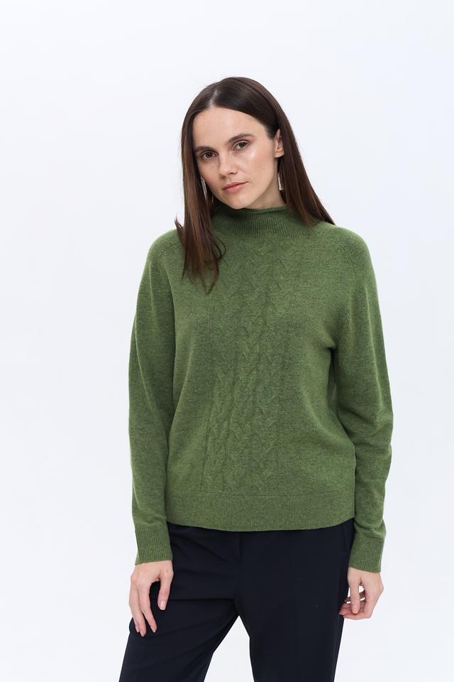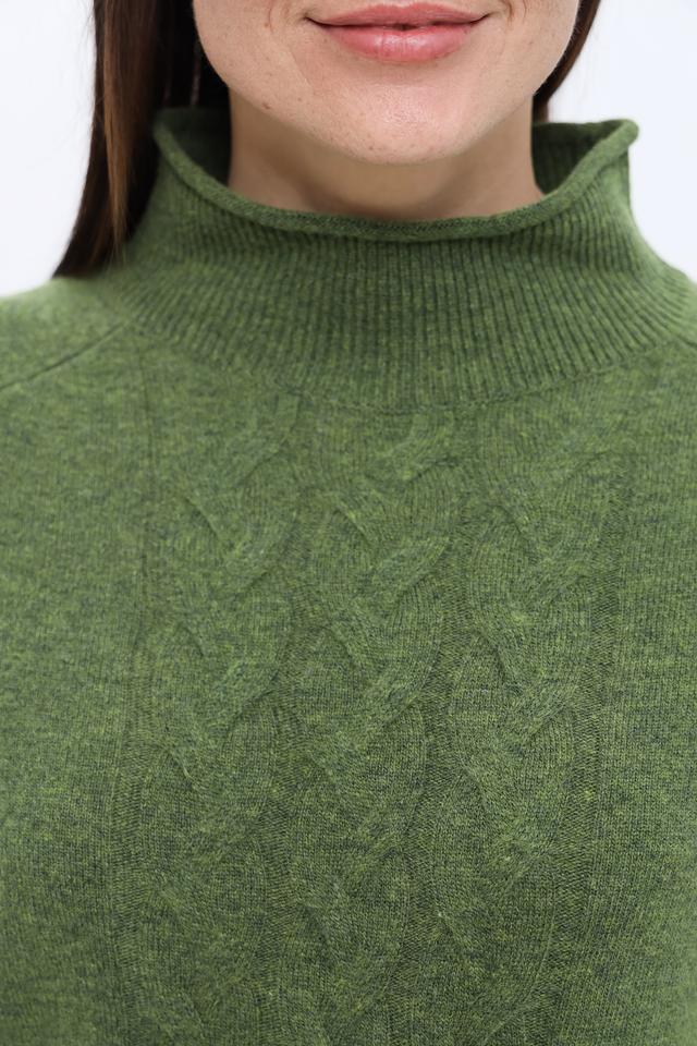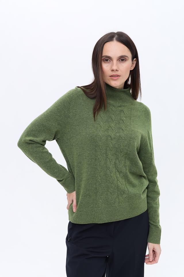 Пуловер имеет приятный оливковый цвет и украшен выразительным узором "косы" на передней части. Высокий воротник добавляет элегантности и защищает от холода. Классический крой и длинные рукава делают этот пуловер универсальным элементом гардероба.