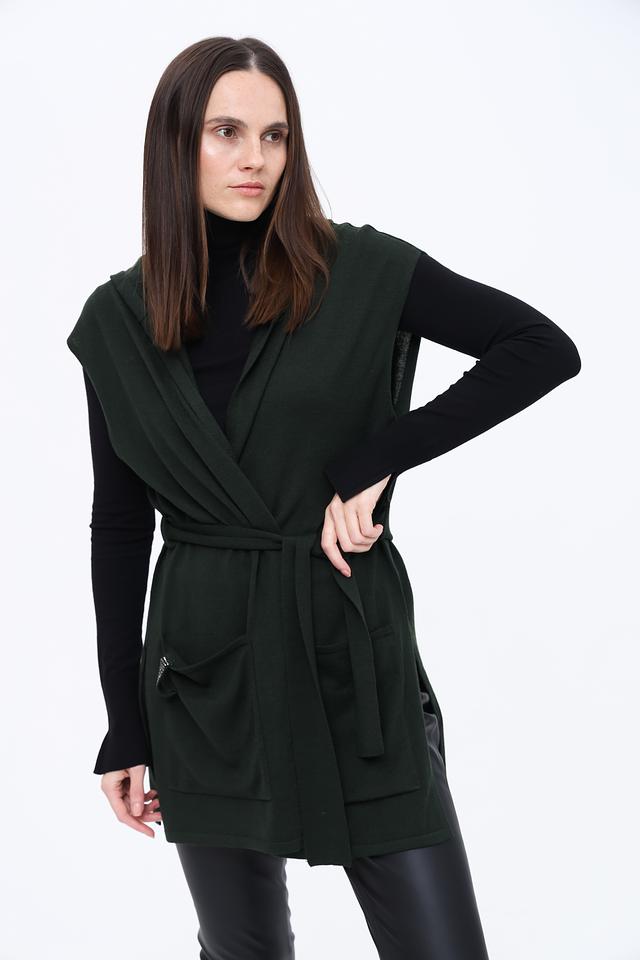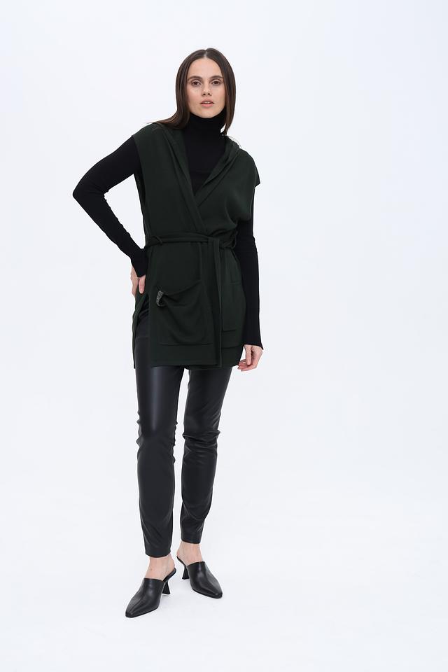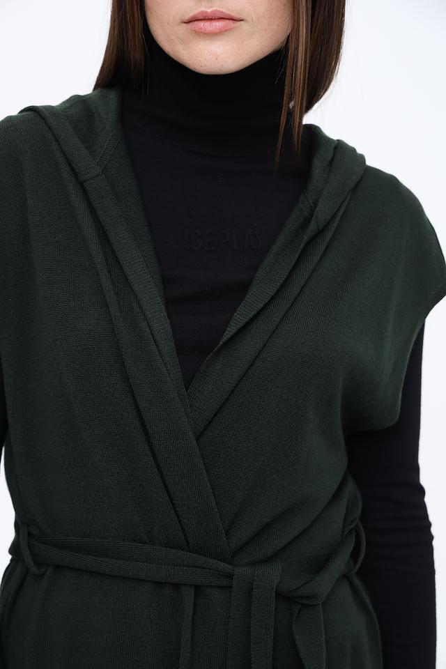 Тёмно-зелёный жилет Pezzo с капюшоном и поясом – стильное и комфортное решение для создания многослойных образов. Изготовлен из мягкого трикотажа с добавлением шерсти, что обеспечивает тепло и уют. Состав: шерсть 50%, акрил 50%