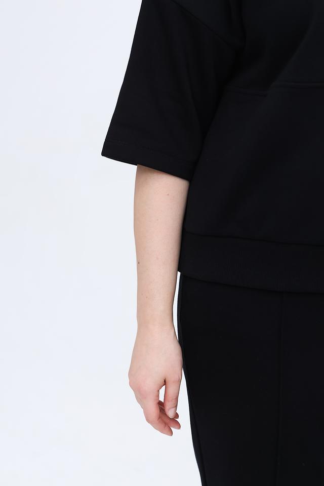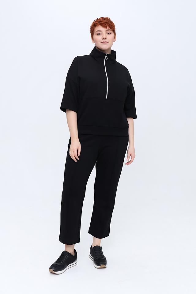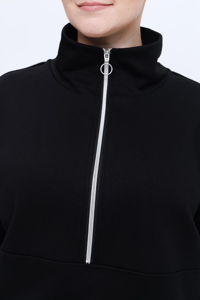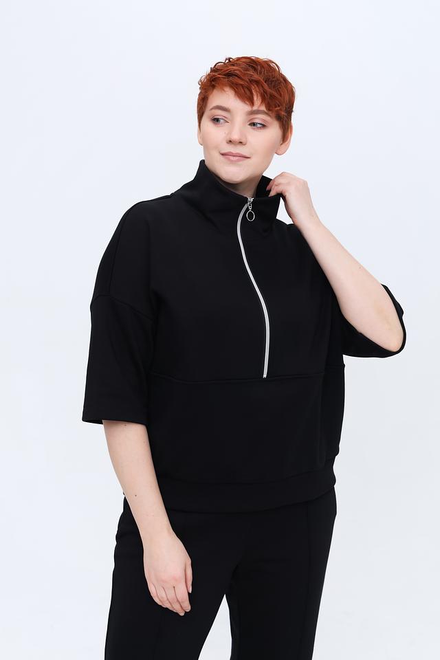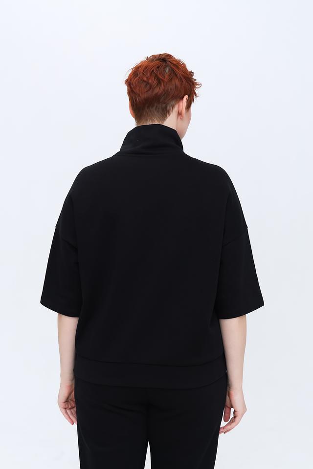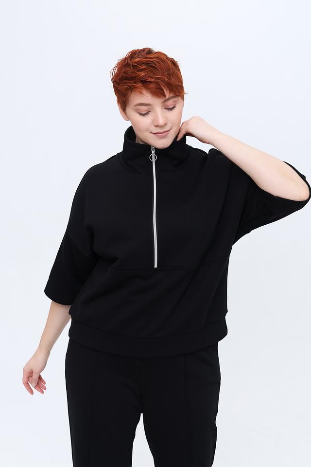 Пуловер имеет удобный крой с короткими рукавами и слегка завышенной горловиной, которая застёгивается на молнию. Белая молния добавляет контраст и делает модель более интересной.