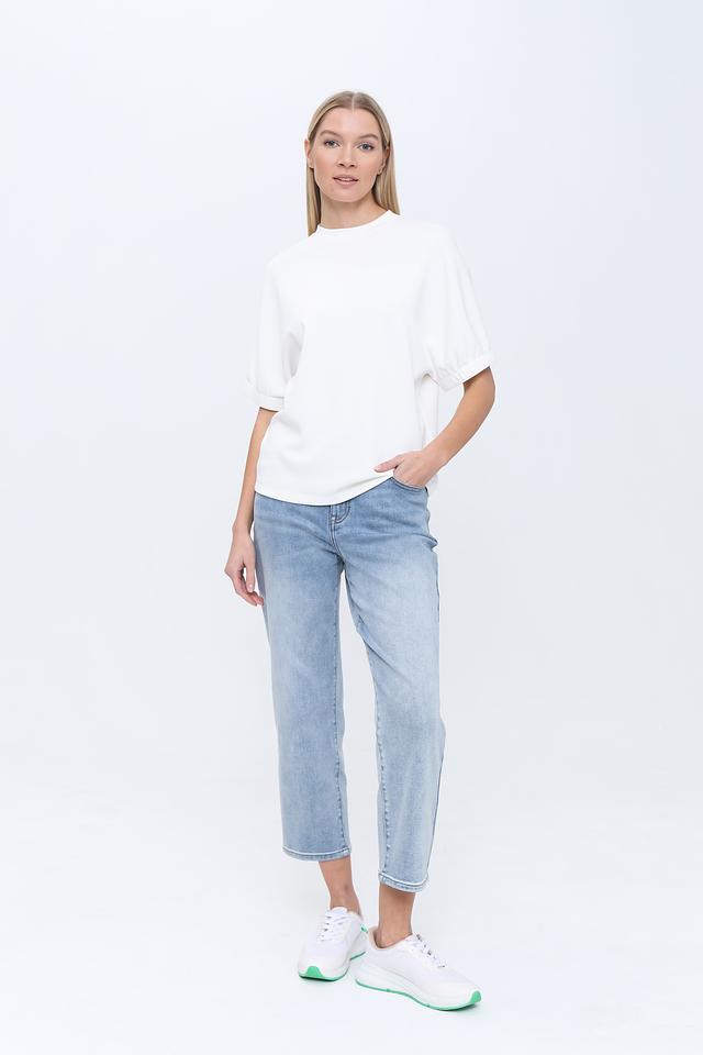 Футболка имеет свободный крой, который не сковывает движений и позволяет создать расслабленный образ. Короткие рукава-фонарики добавляют модели оригинальности и женственности. Круглый вырез горловины лаконично дополняет дизайн.