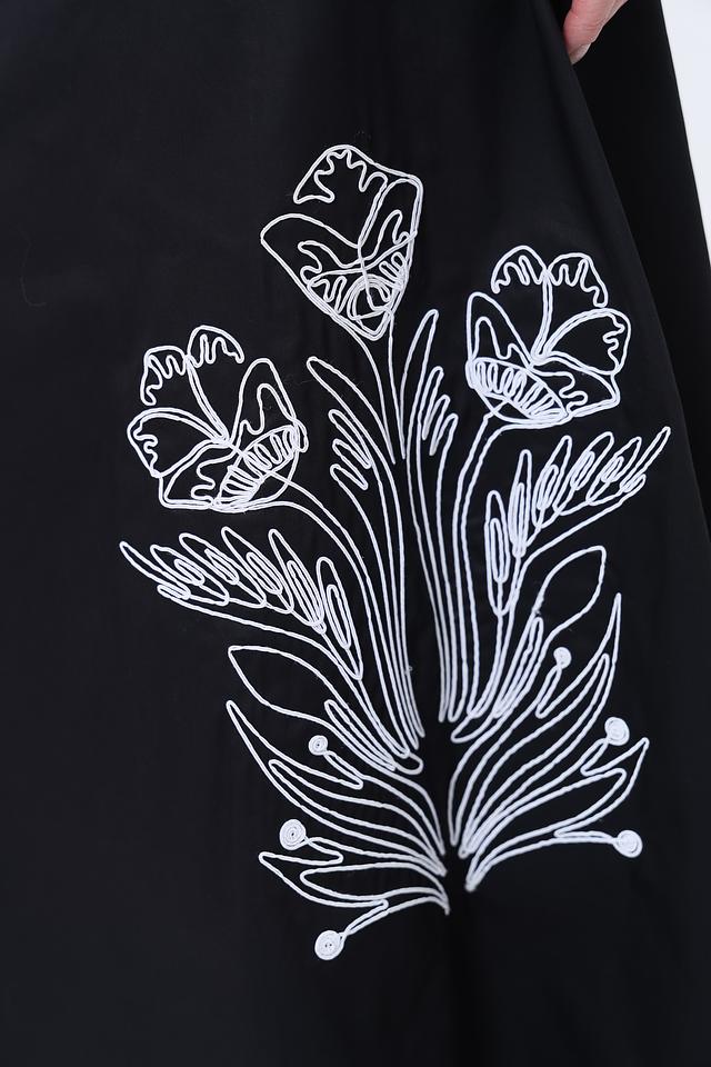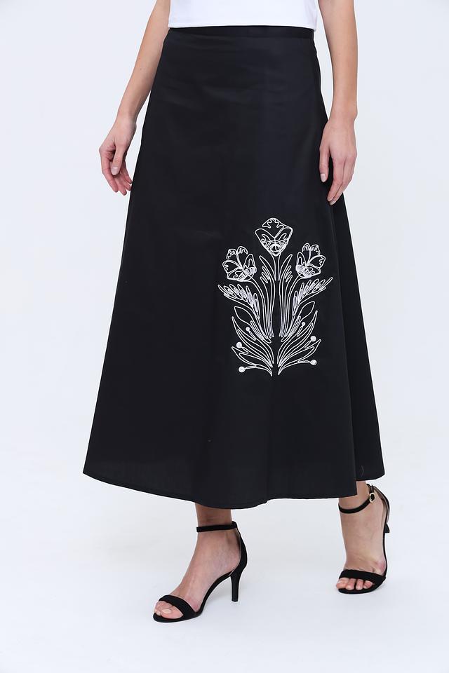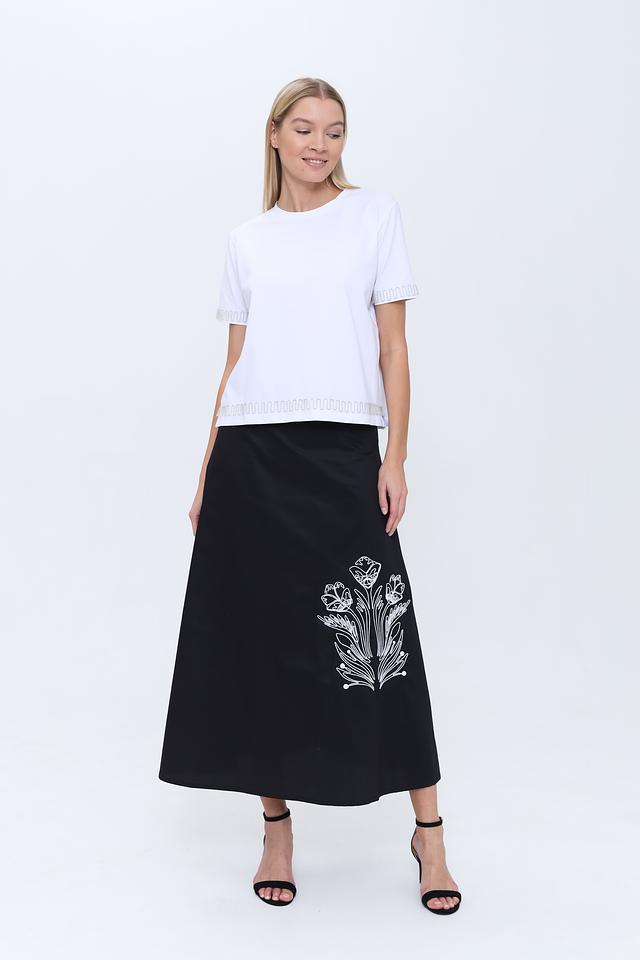 Юбка имеет длину макси и прямой крой, что обеспечивает комфортную посадку по фигуре. Особый акцент сделан на вышивку белым цветом, изображающую стилизованный цветочный орнамент. Эта деталь придает юбке изысканность и оригинальность.