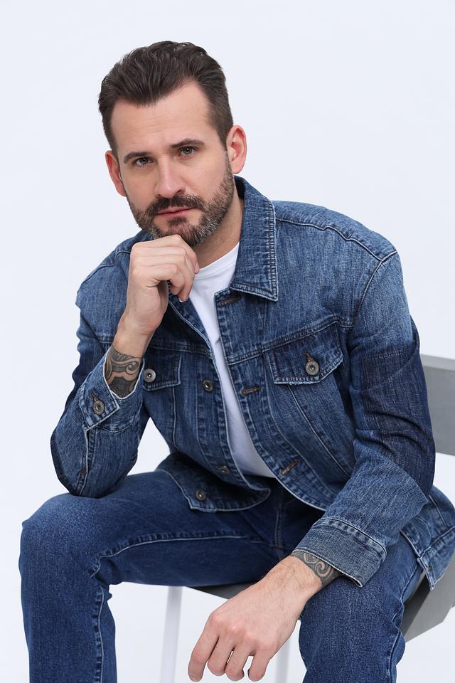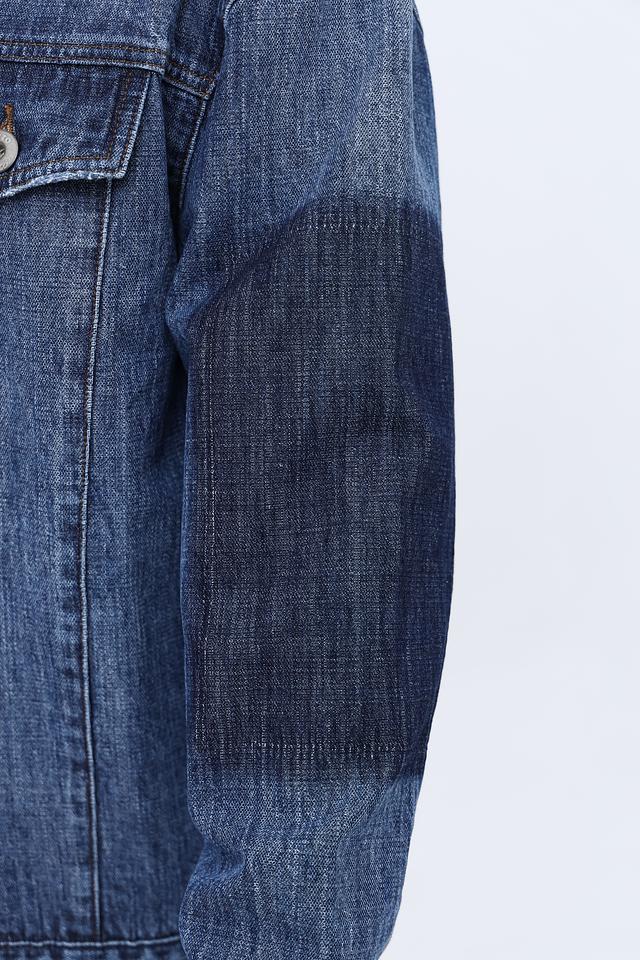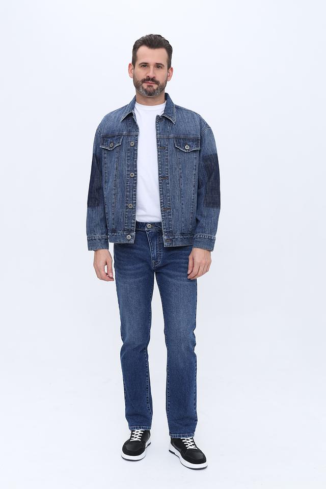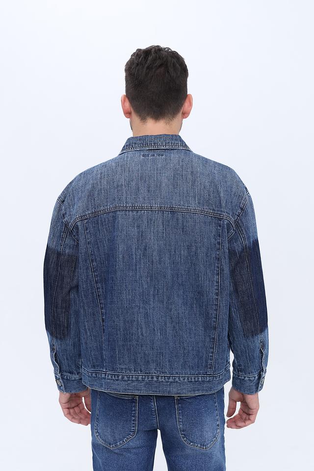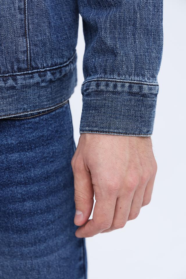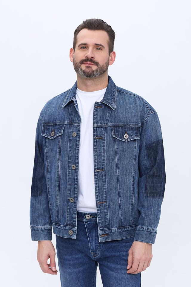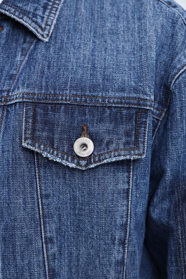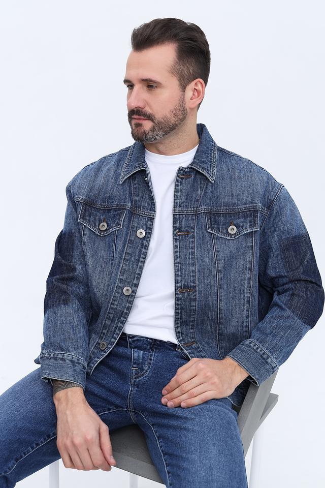 Куртка имеет классический джинсовый дизайн с отложным воротником и застежкой на пуговицах. На груди и рукавах расположены накладные карманы, добавляющие функциональности и стиля. Цвет куртки – насыщенный синий, с эффектом лёгкого выцветания, что придаёт ей винтажный вид.