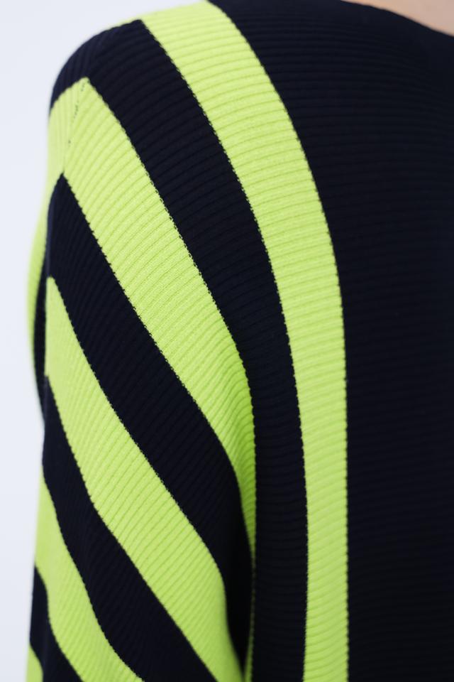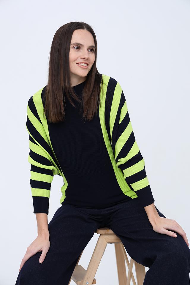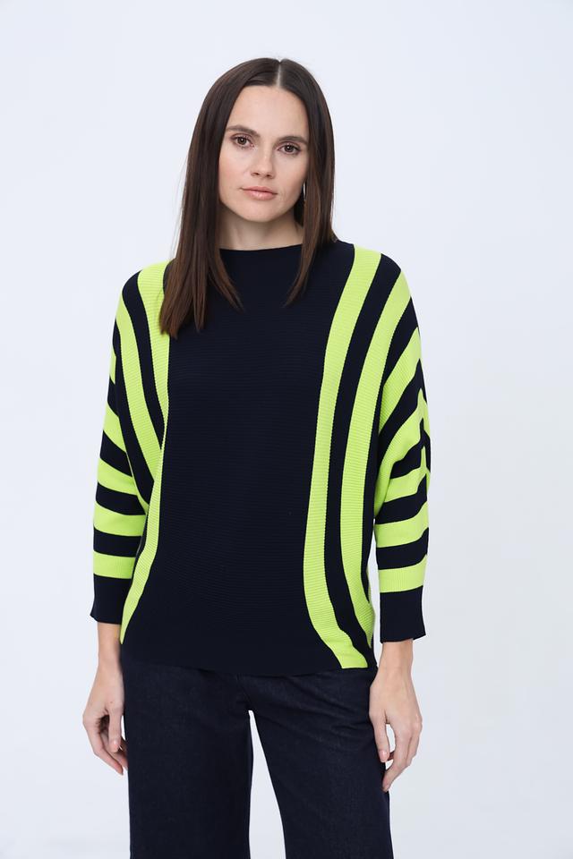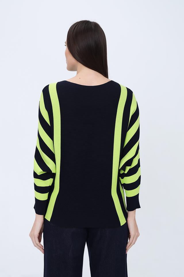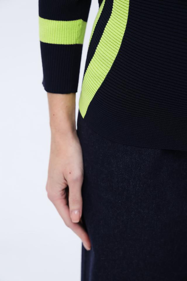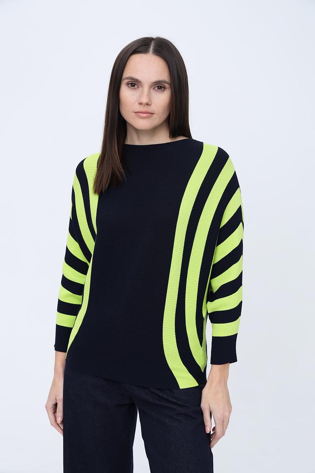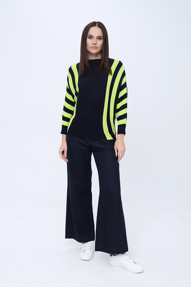 Джемпер Pezzo темно-синего цвета с яркими полосками лайм станет стильным дополнением к вашему гардеробу. Модель выполнена из мягкого и приятного к телу трикотажа, обеспечивающего комфорт в носке. Состав: вискоза 65%, нейлон 35%