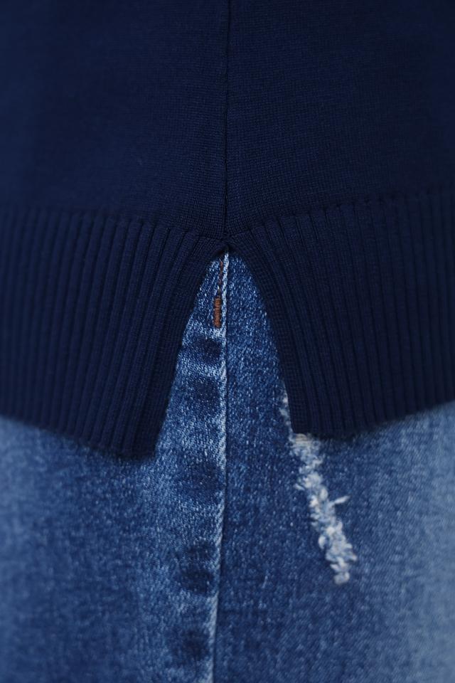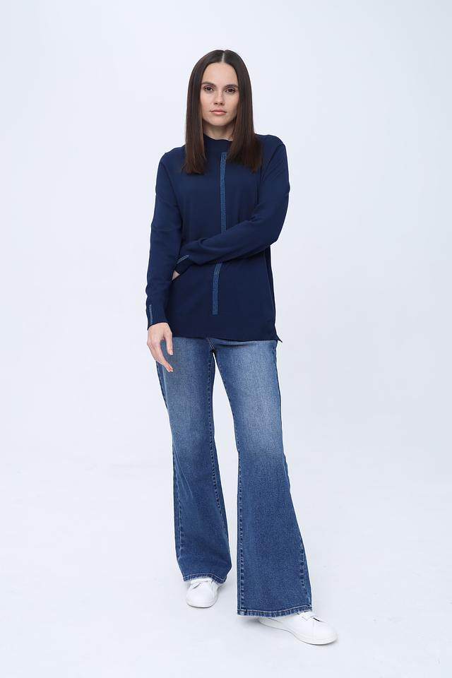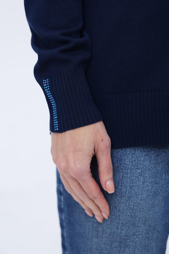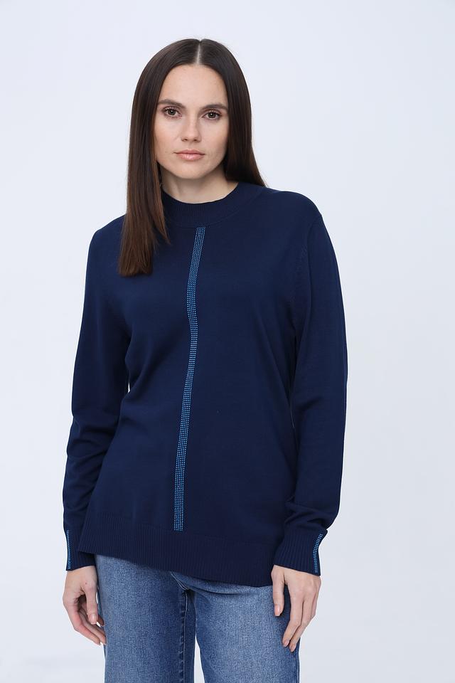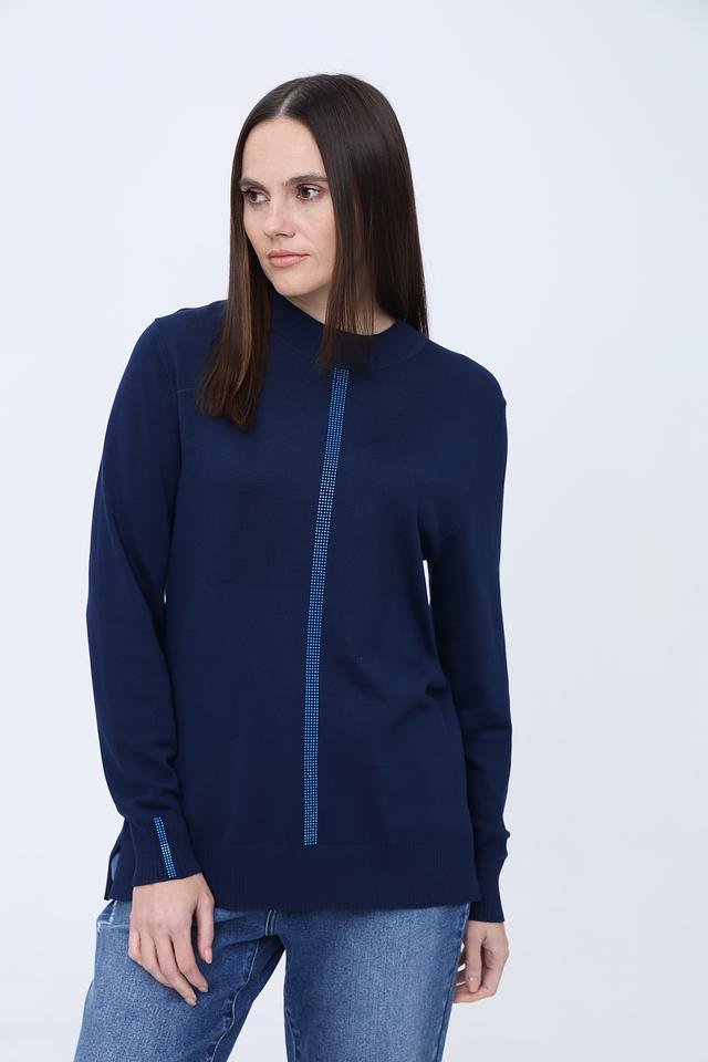Особенностью данного пуловера является вертикальная полоса из сверкающих страз, которая добавляет изделию изысканности и привлекает внимание. Высокий воротник-стойка придает образу элегантность и защищает от холода.