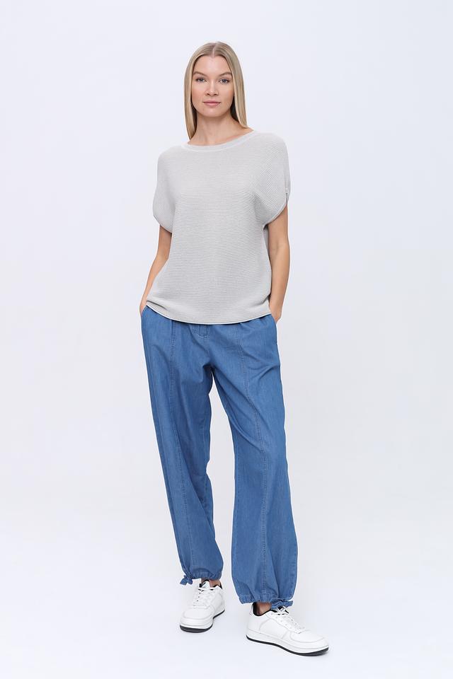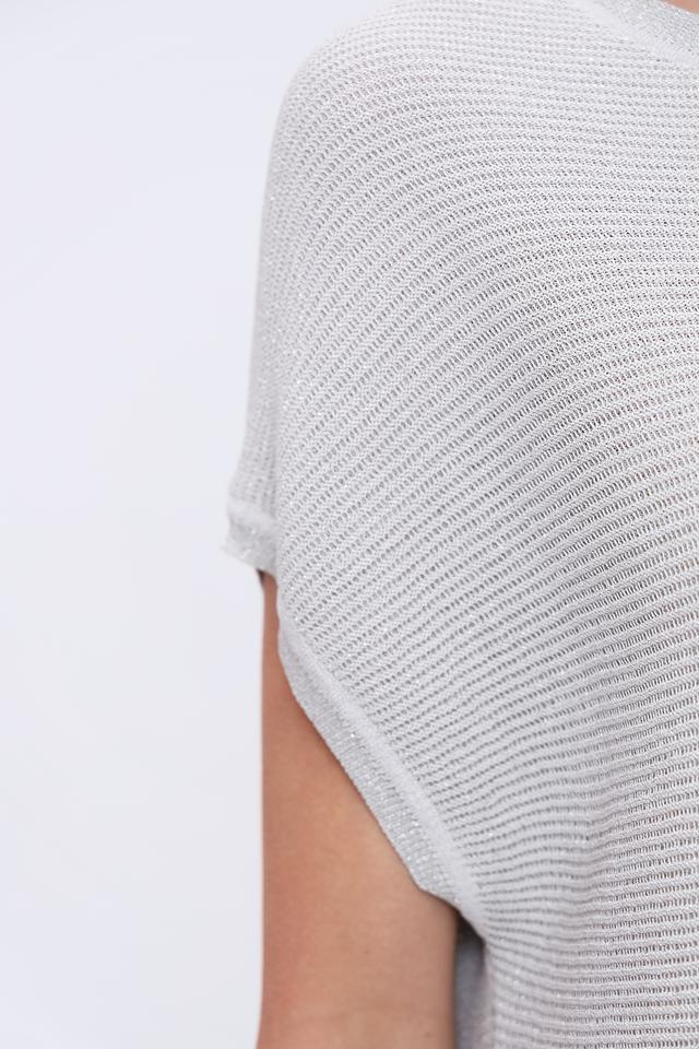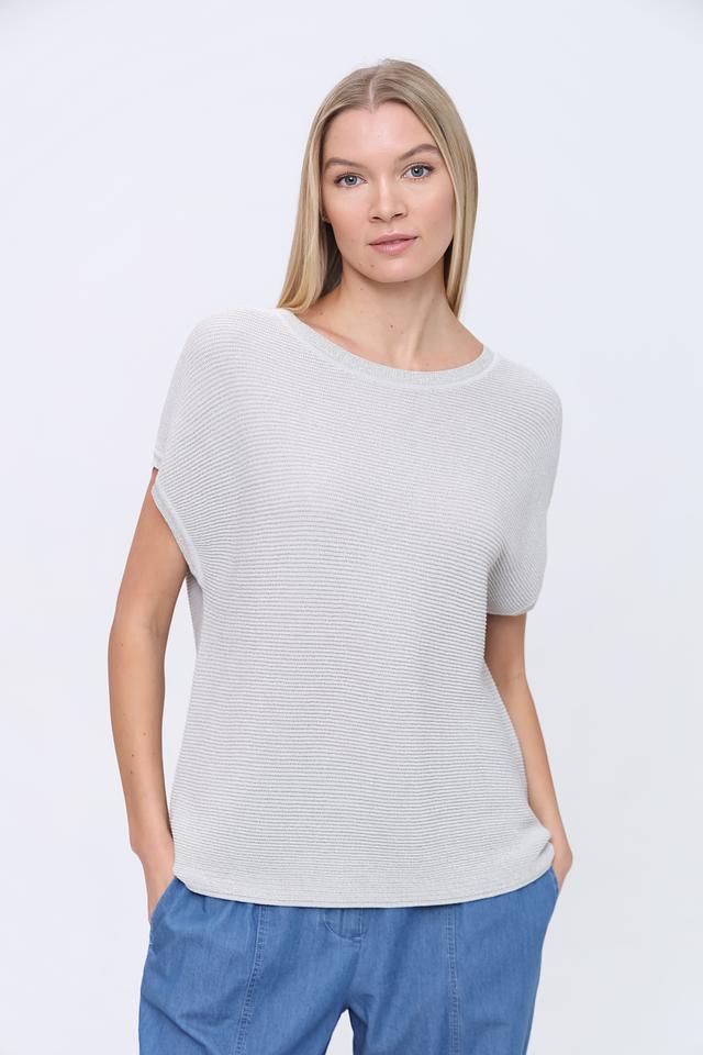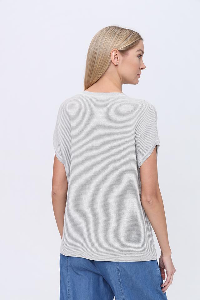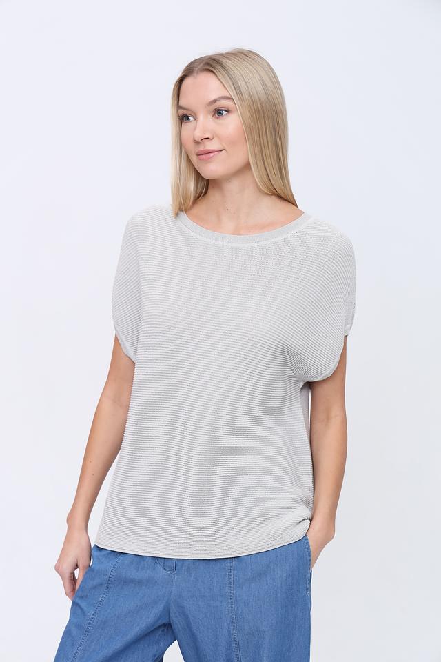Этот пуловер от Pezzo выполнен в светло-серой расцветке с вертикальными полосами, создающими визуально стройный силуэт. Модель имеет свободный крой и короткие рукава, что делает ее идеальной для теплой погоды.