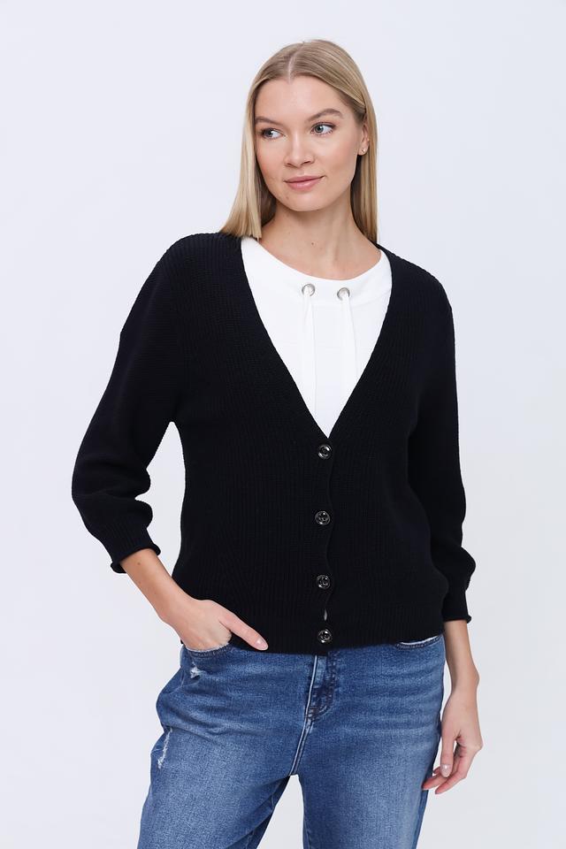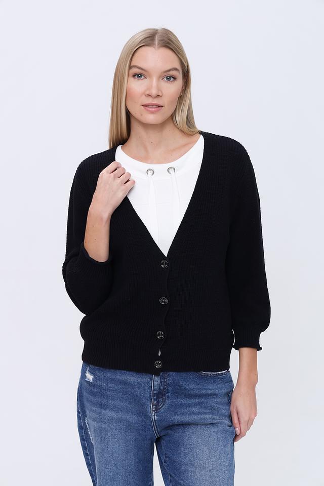 Чёрный кардиган Pezzo из 100% хлопка — удобная и стильная модель на пуговицах. Укорочённый крой и рукава 3/4 делают этот кардиган универсальным дополнением к любому образу. Состав: хлопок 100%