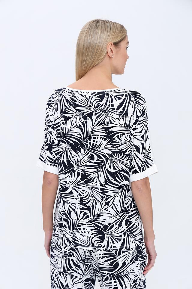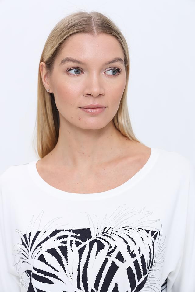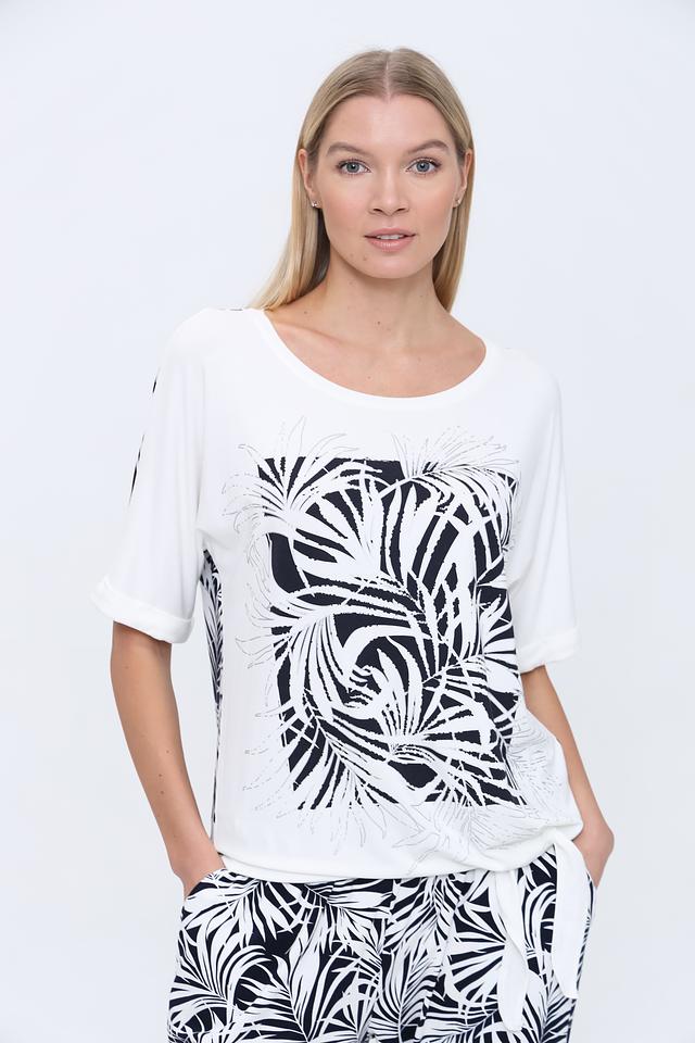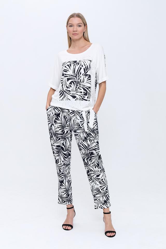 Основной цвет футболки – белый, а главным акцентом является яркий и стильный принт в виде абстрактных листьев, выполненный в чёрно-белой гамме. Принт расположен на передней части изделия и придает ему оригинальность.