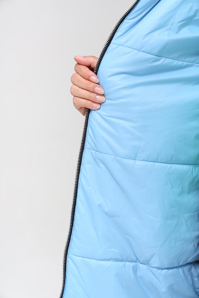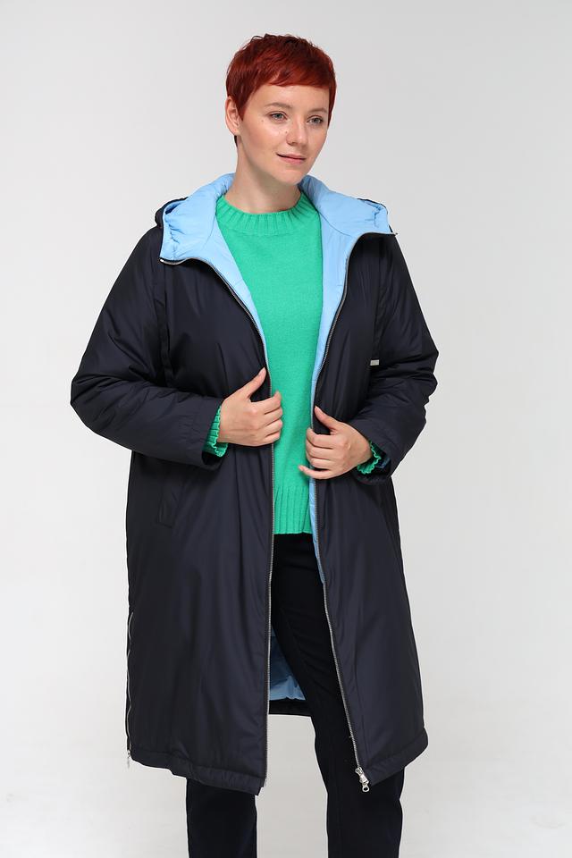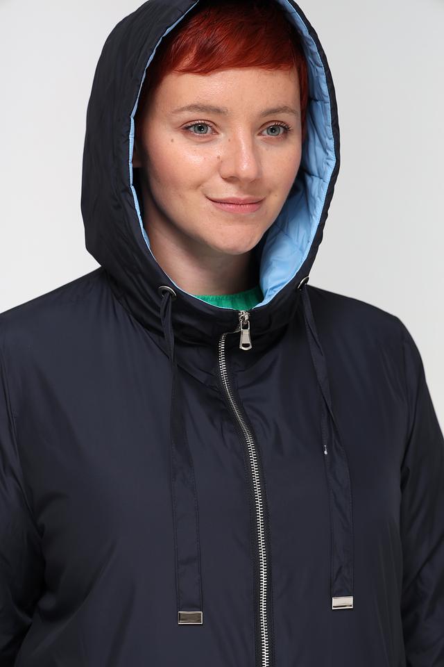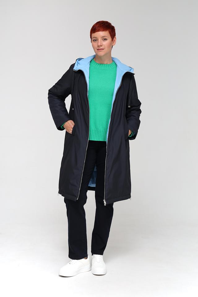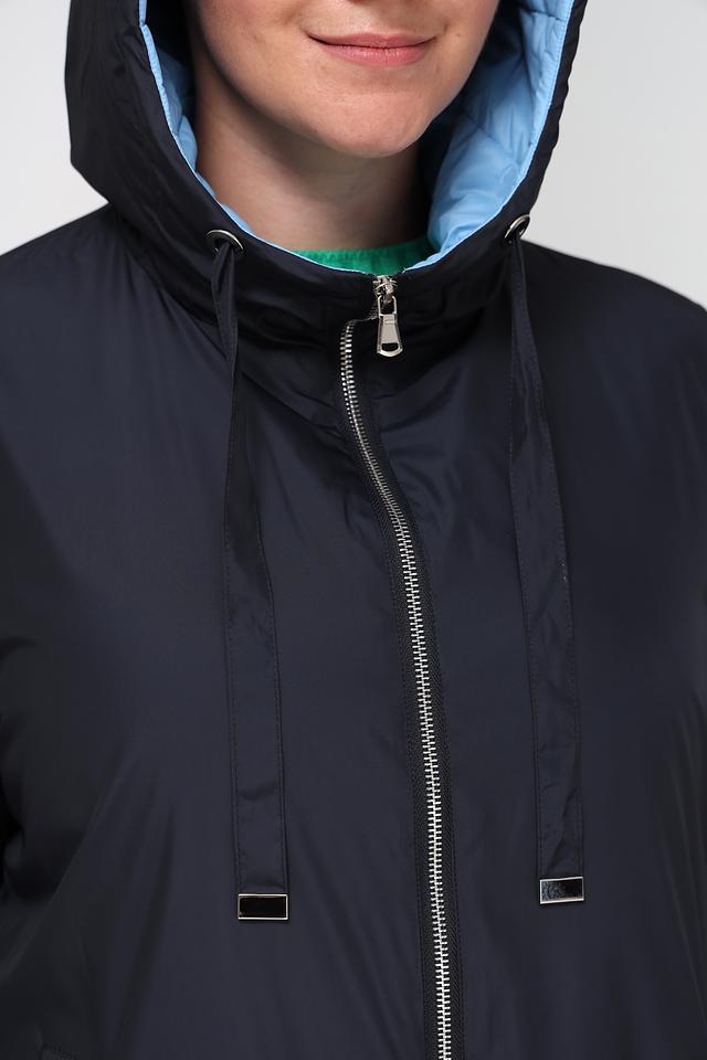 Внутренняя часть капюшона и манжеты выполнены в светло-голубом цвете, что добавляет контраст и оригинальность. Пальто идеально подойдет для повседневной носки в прохладную погоду.