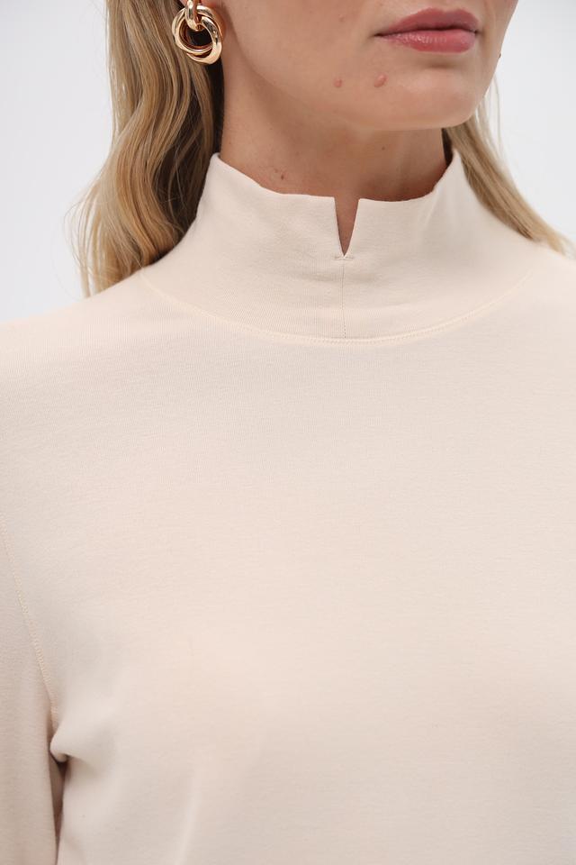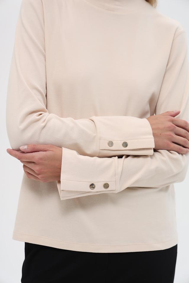 Модель имеет классический крой с длинными рукавами и высоким воротником-стойкой. На рукавах расположены декоративные пуговицы в тон изделия, которые придают водолазке особый шарм.
