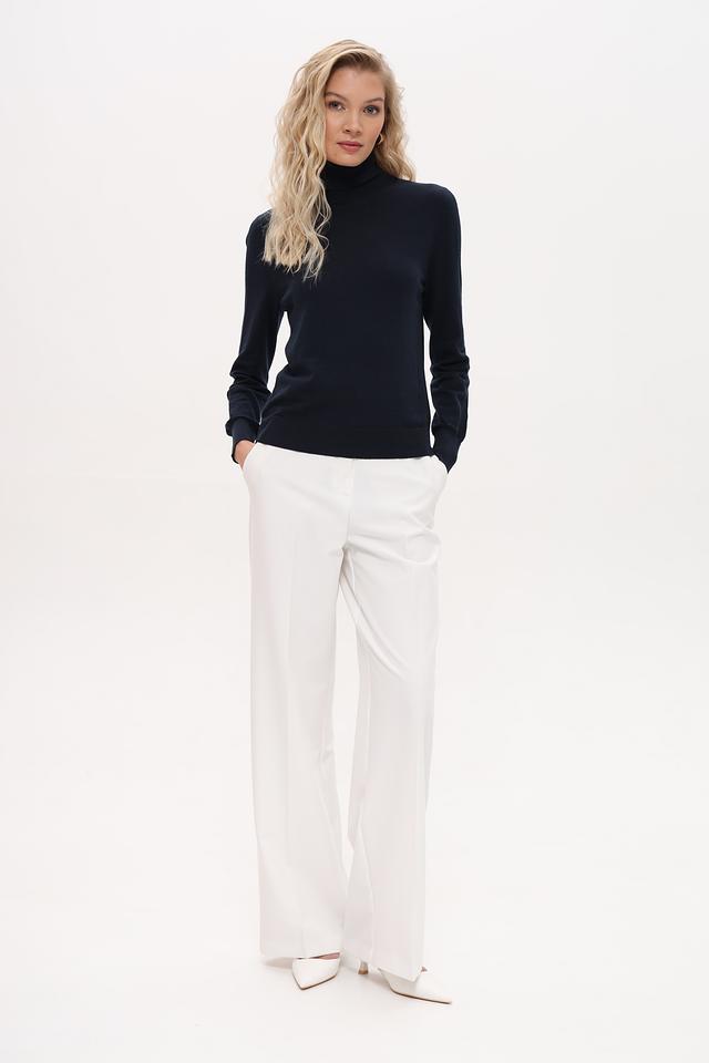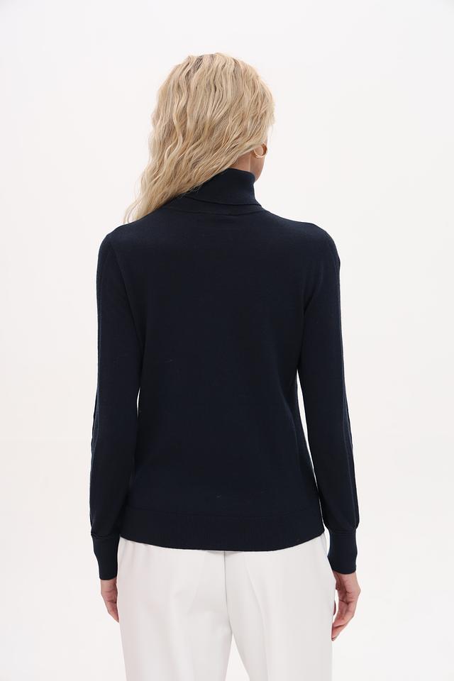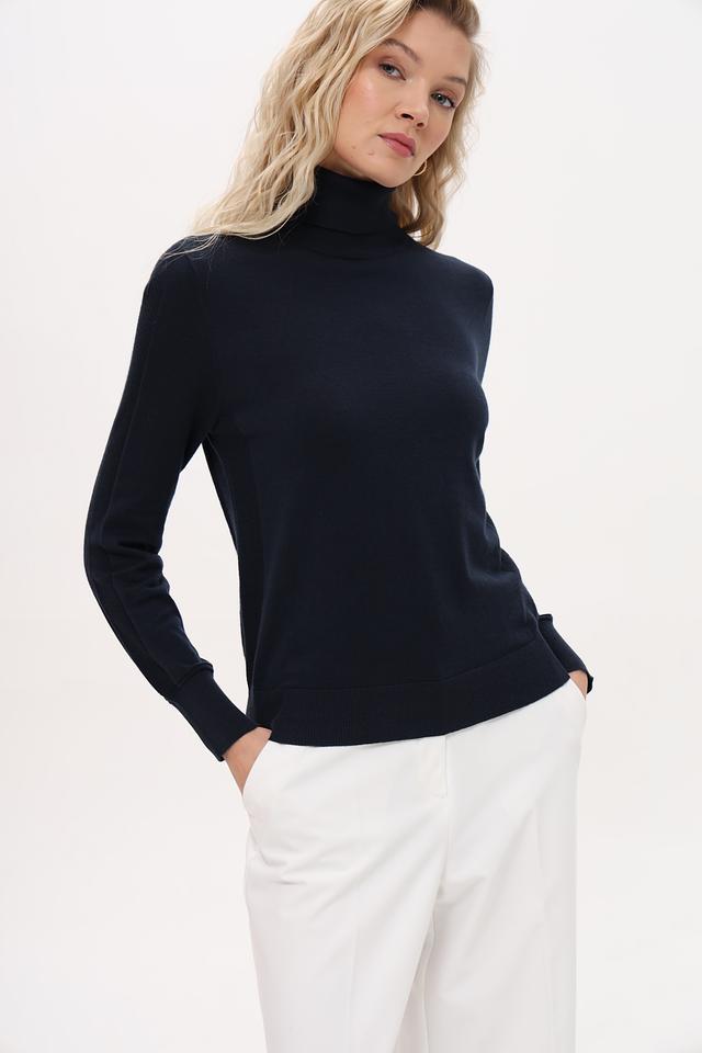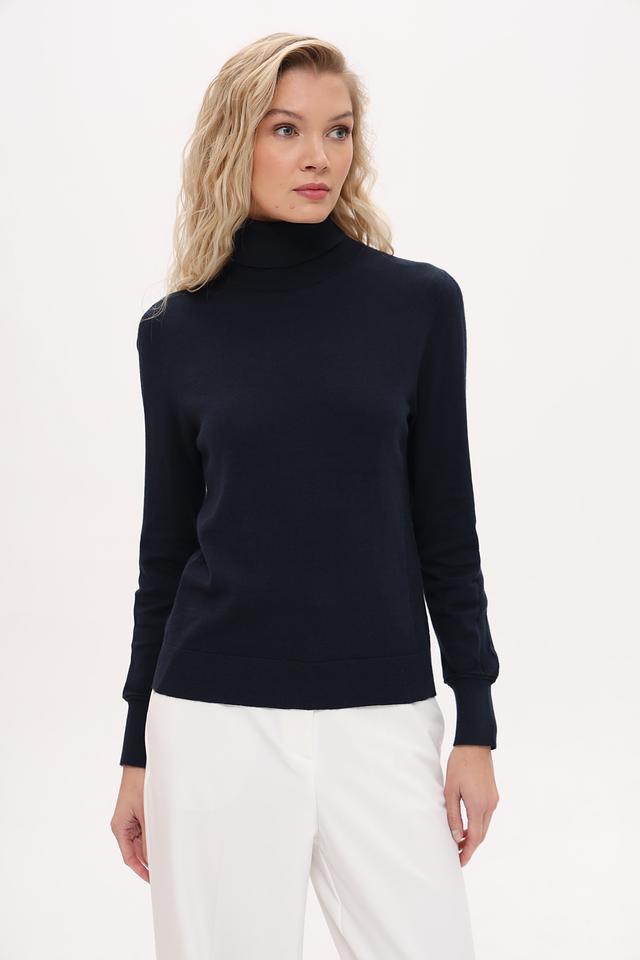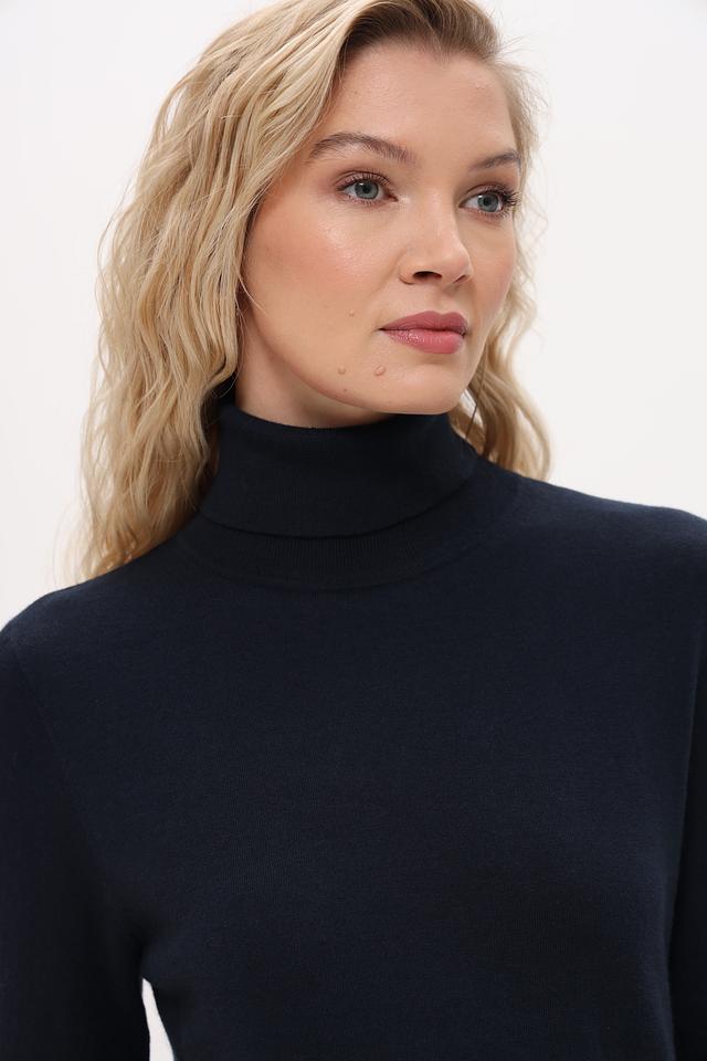 Водолазка имеет длинные рукава и классический круглый вырез горловины. Тёмно-синий цвет делает её универсальной и легко сочетаемой с другими элементами гардероба. Материал приятен к телу и не сковывает движений.