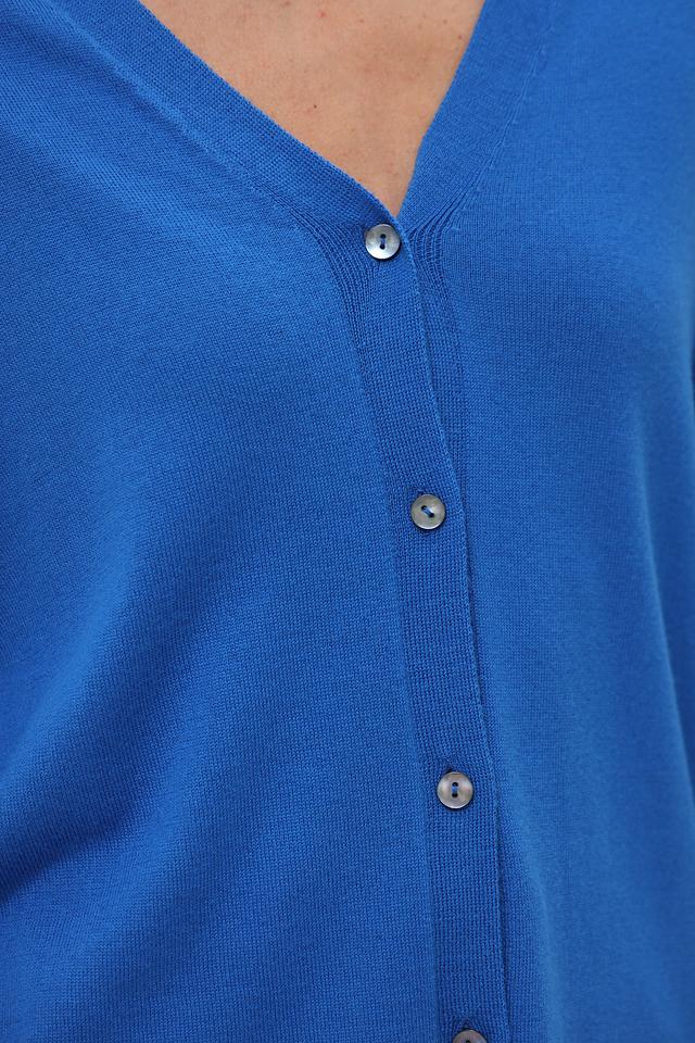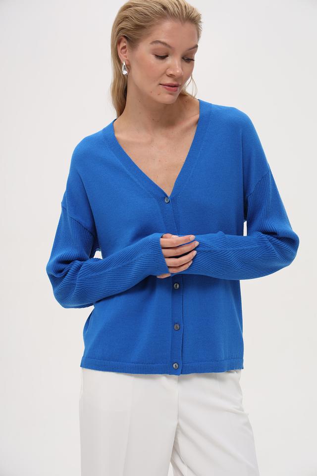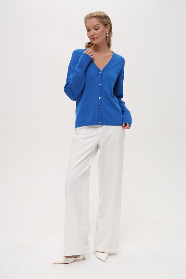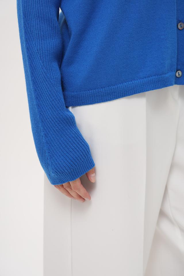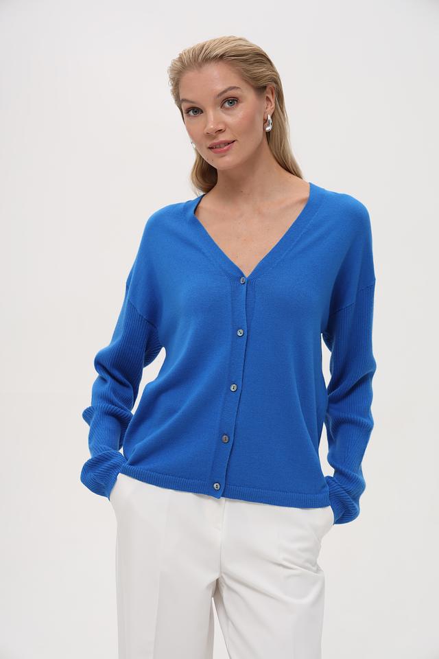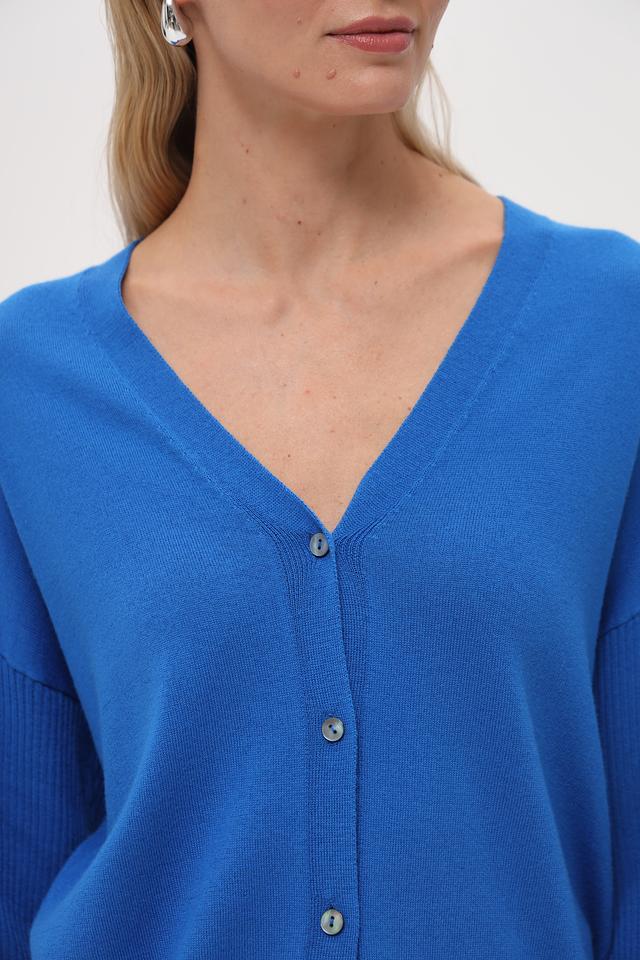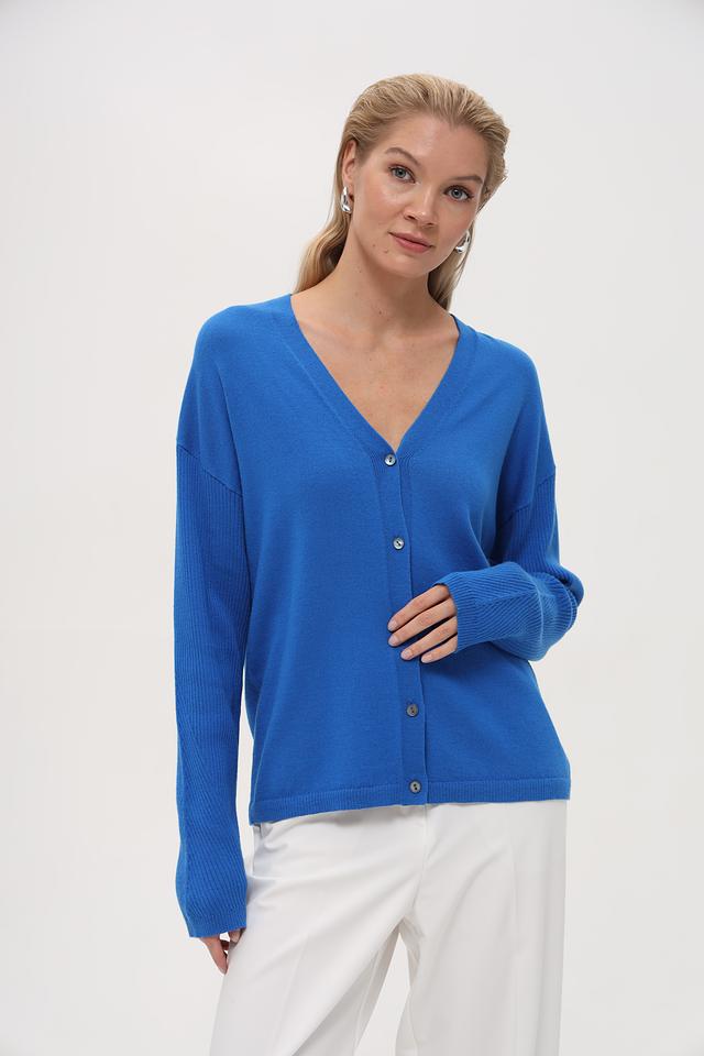 Синий вязаный жакет Pezzo из шерсти и хлопка – стильное и комфортное решение для создания уютных образов. Модель с V-образным вырезом и длинными рукавами. Состав: шерсть 57%, хлопок 43%. Состав: шерсть 57%, хлопок 43%