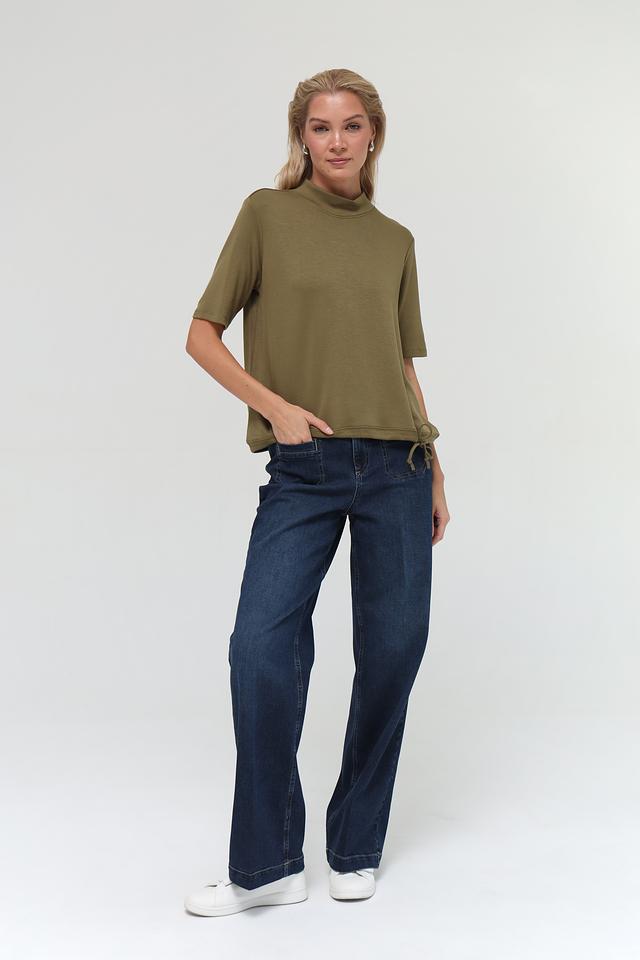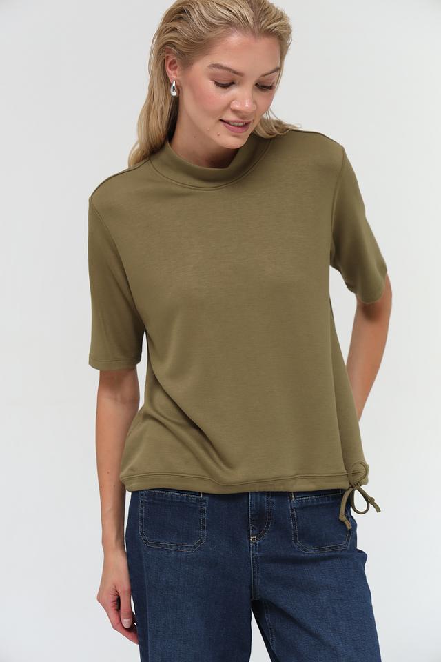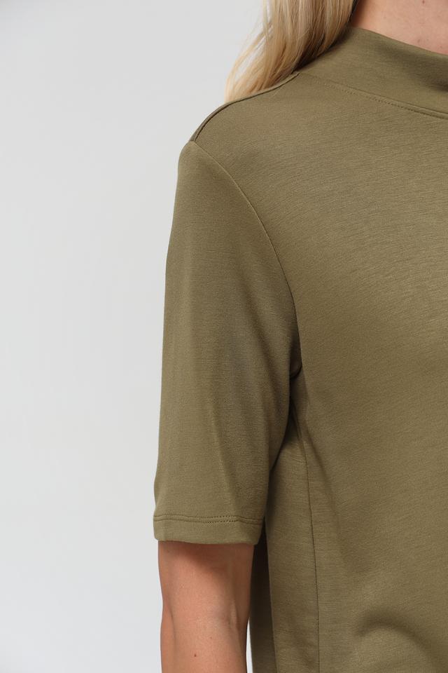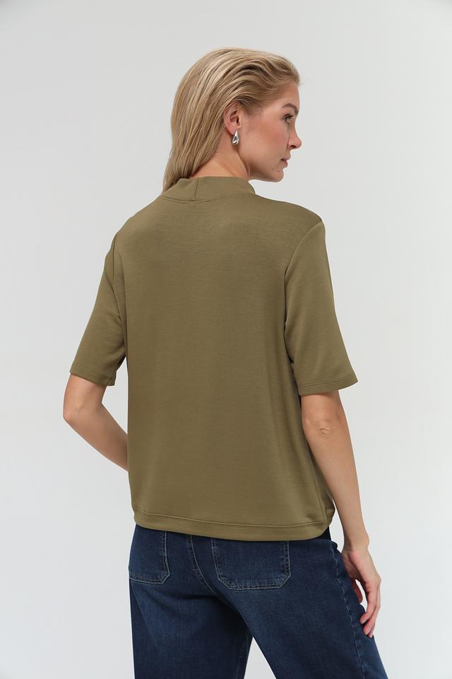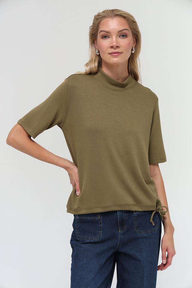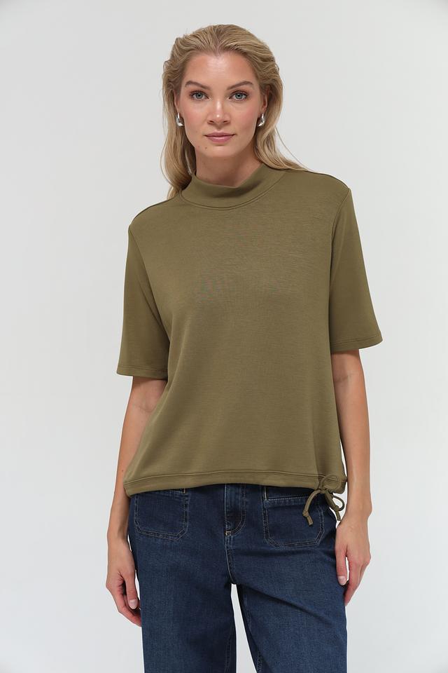 Женский пуловер Pezzo цвета хаки с коротким рукавом и завязками по бокам. Изготовлен из мягкого и приятного к телу сочетания вискозы, полиэстера и эластана. Состав: район 82%, полиэстер 14%, эластан 4%