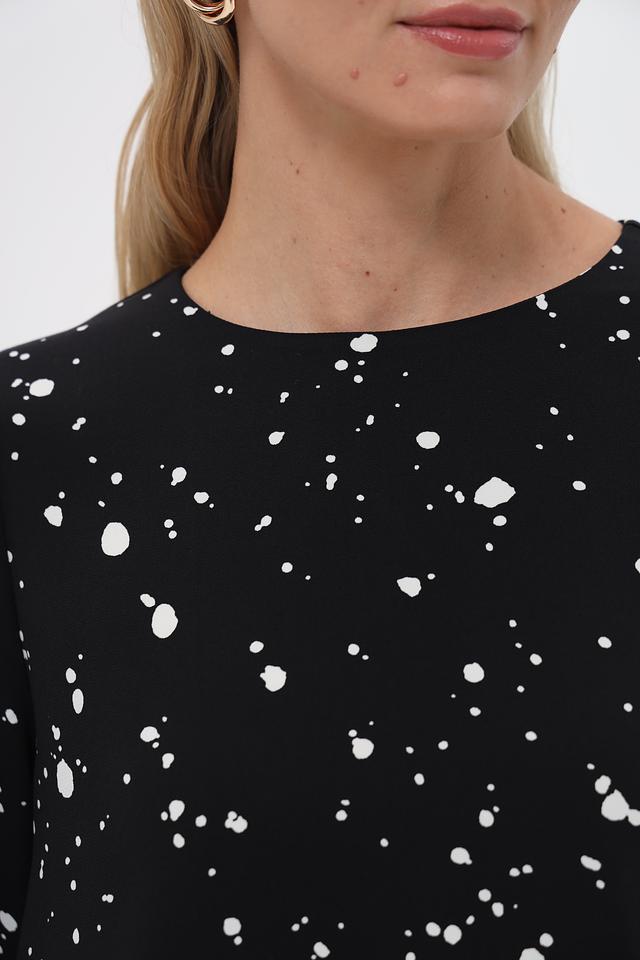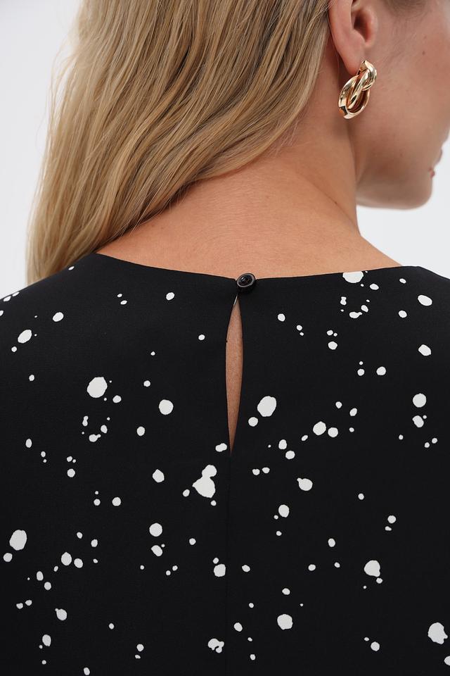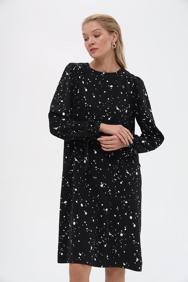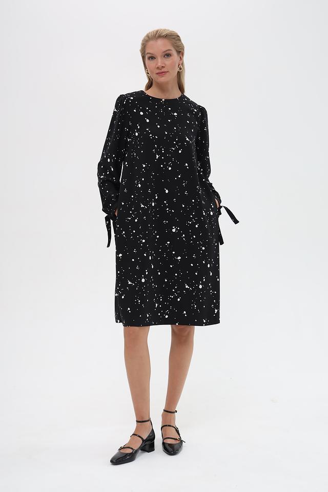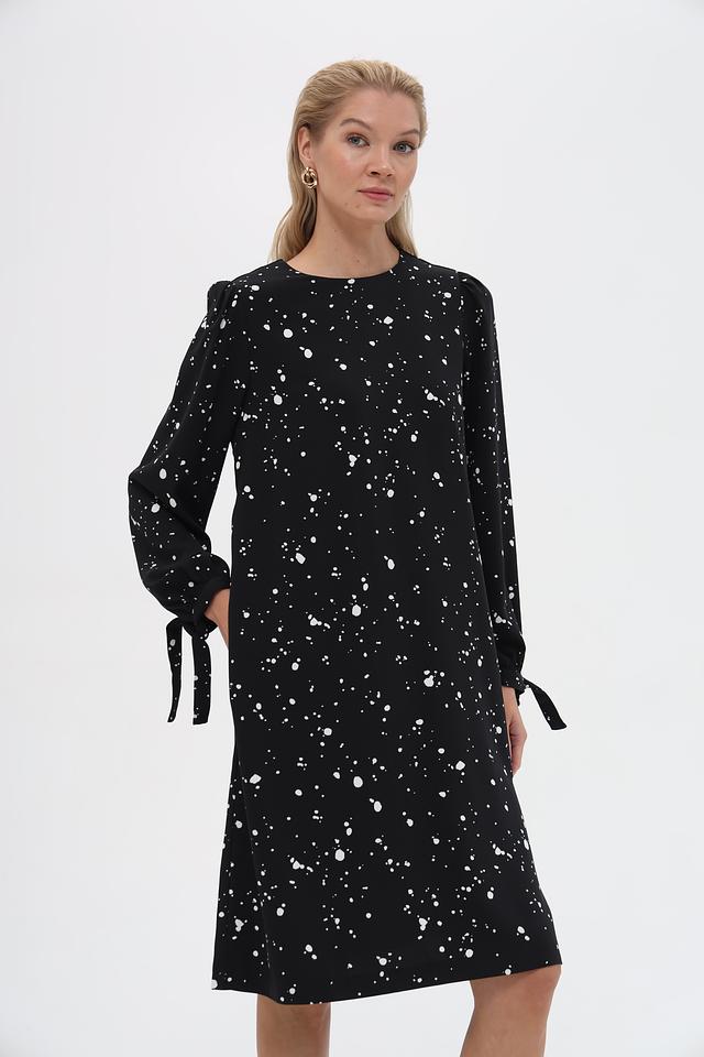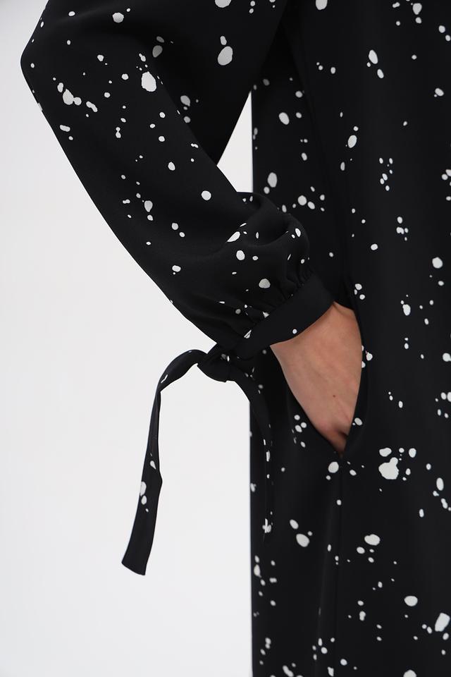 Платье декорировано ярким принтом в виде разбросанных белых горошин на чёрном фоне. Удлиненные рукава дополнены аккуратными завязками, которые позволяют регулировать их длину и создавать различные образы.