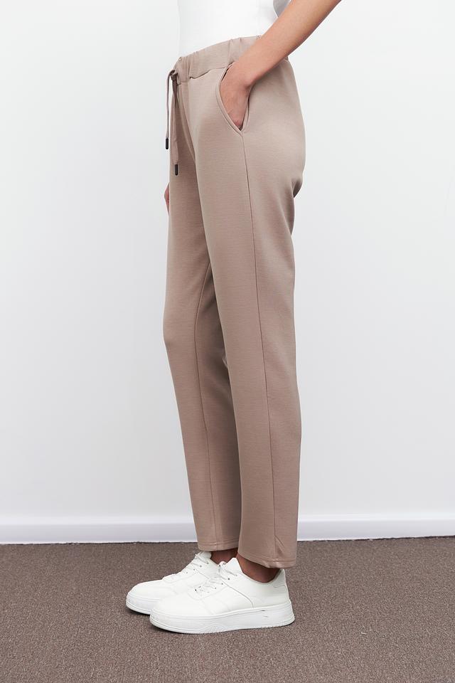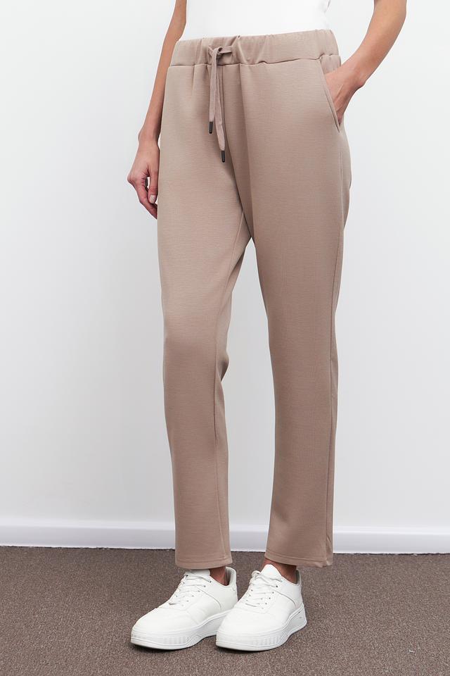 Особенности модели: удобный пояс на резинке с регулирующими шнурками, боковые карманы. Прямой крой и укороченная длина делают эти брюки универсальными и подходящими для создания различных образов – от повседневных до более элегантных.