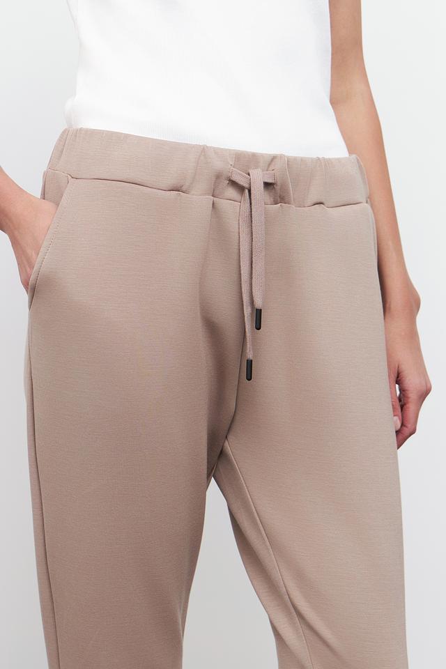 Бежевые трикотажные брюки от Pezzo – это комфорт и стиль в одном изделии. Модель выполнена из мягкого и приятного к телу материала с добавлением эластана, обеспечивающего свободу движений. Удобный пояс на резинке и боковые карманы делают эти брюки идеальным выбором для повседневной носки. Состав: модал 51%, полиэстер 44%, эластан 5%
