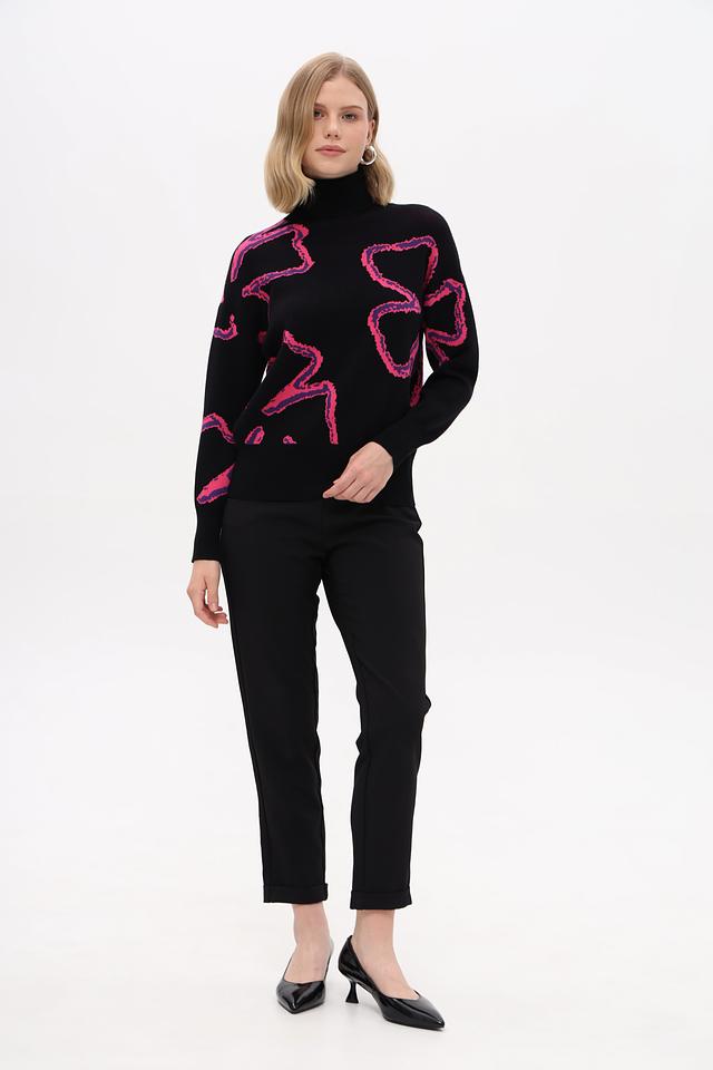 Чёрный пуловер Pezzo с оригинальным розовым абстрактным рисунком. Изготовлен из мягкой вискозы с добавлением полиэстера для комфорта и износостойкости. Высокий воротник и приталенный силуэт. Состав: вискоза 72%, полиэстер 28%