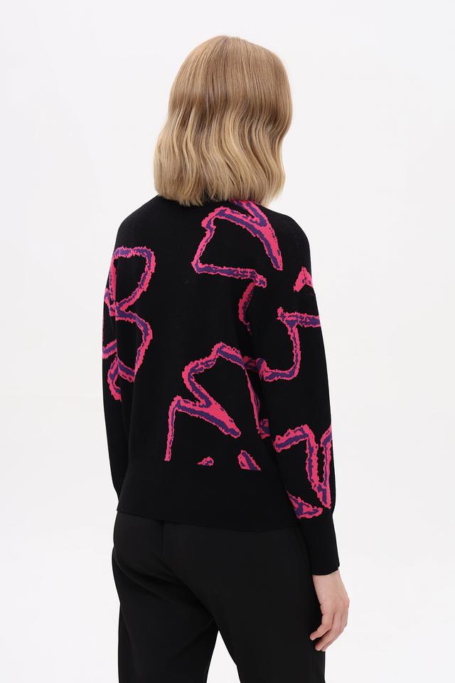 Пуловер имеет высокий воротник, который визуально вытягивает шею и придает образу элегантность. Дизайн дополнен ярким абстрактным рисунком розового цвета, который делает этот пуловер по-настоящему уникальным и стильным. Приталенный силуэт подчеркивает достоинства фигуры.