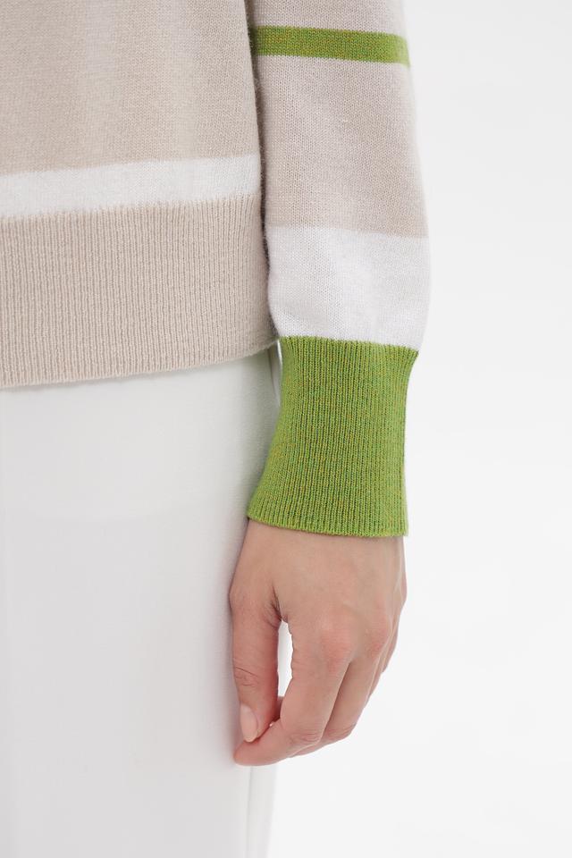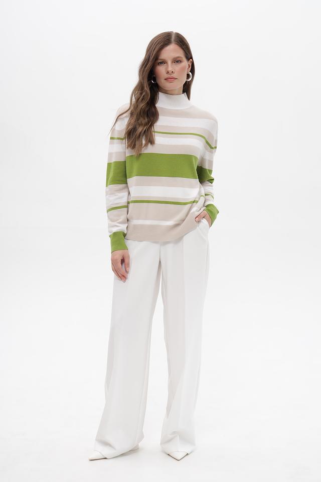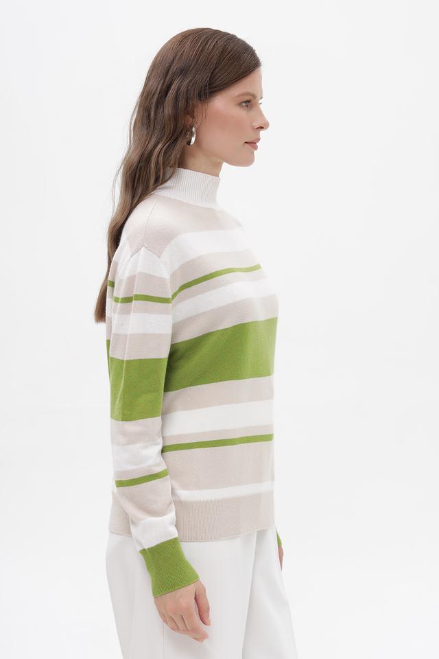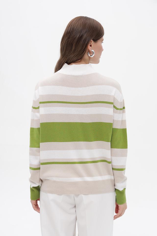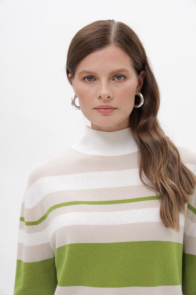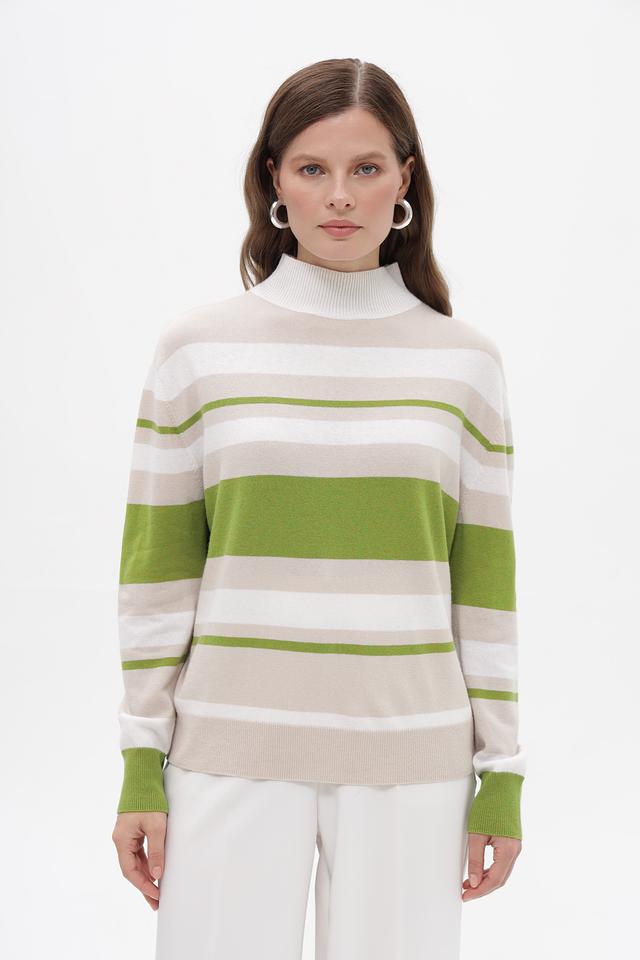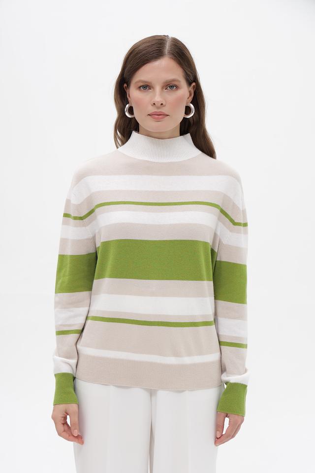 Женский пуловер от бренда Pezzo выполнен в бежевой цветовой гамме с горизонтальными полосами белого и зелёного цветов. Модель имеет приталенный силуэт и высокий воротник, что придает ей элегантный вид.