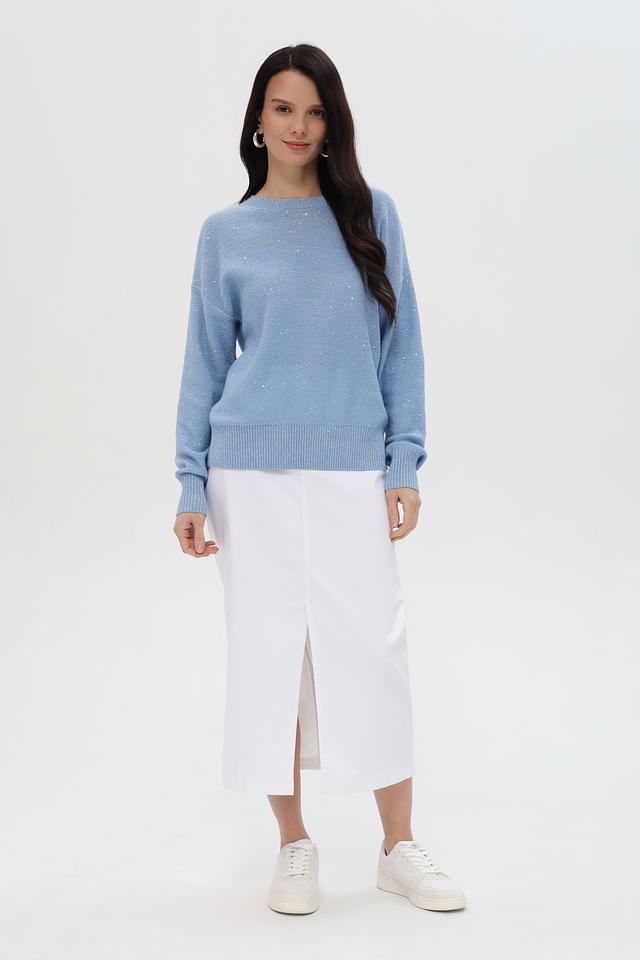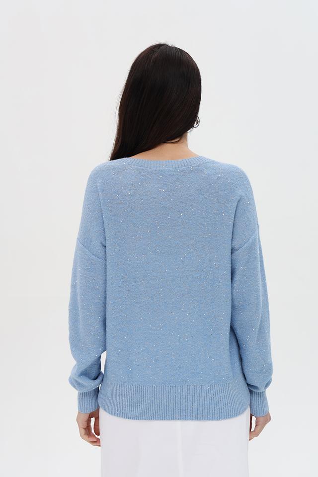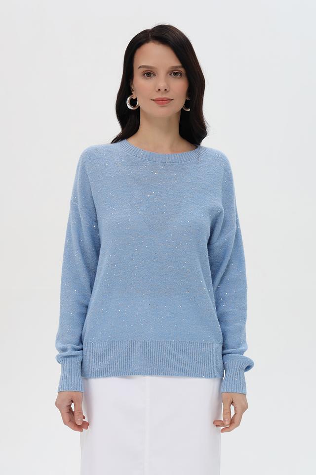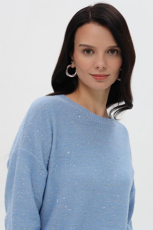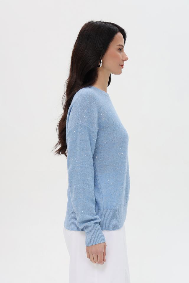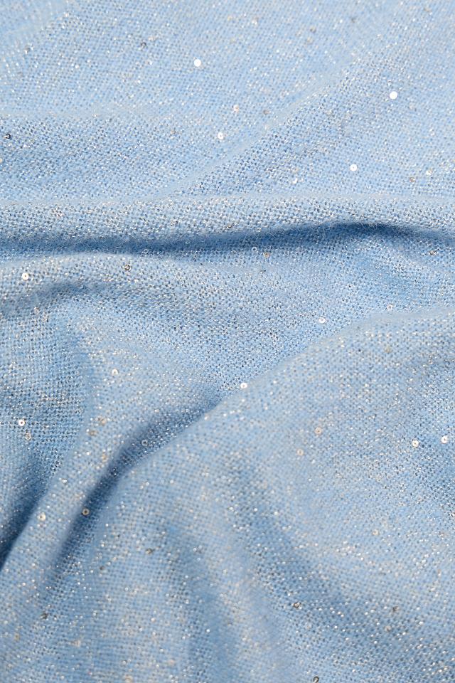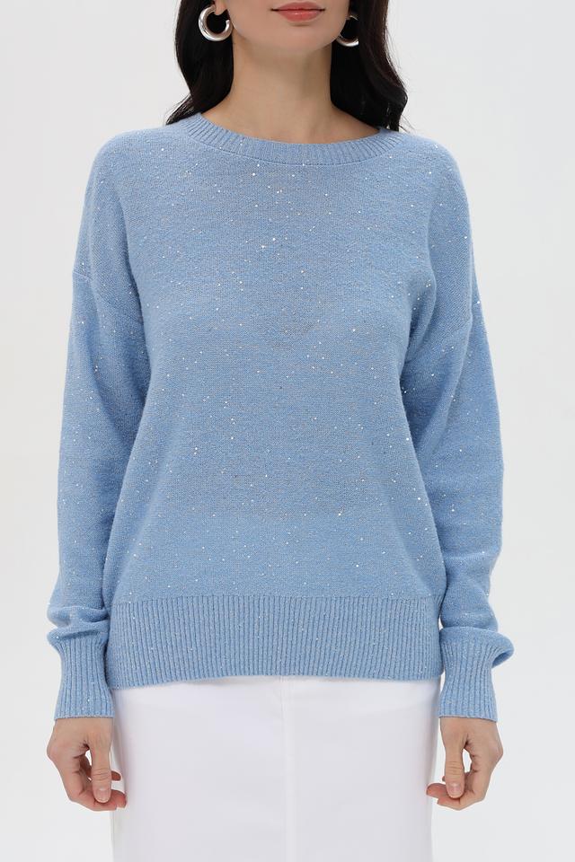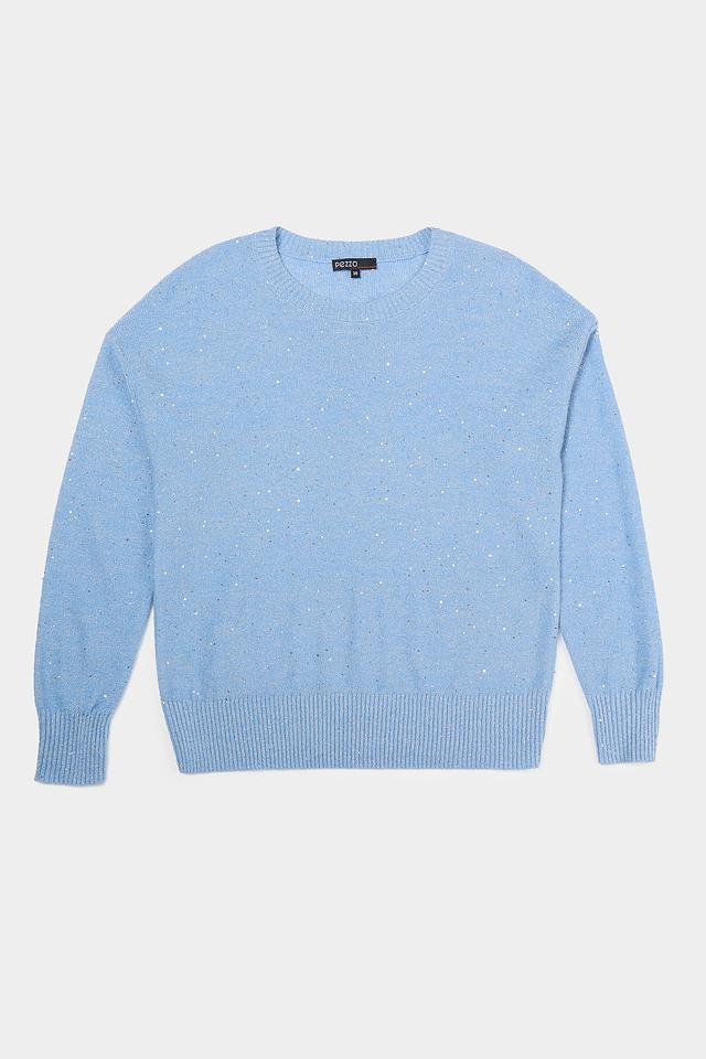 Этот пуловер от Pezzo выполнен в нежном голубом цвете и декорирован мерцающими пайетками, что придает ему праздничный и элегантный вид. Модель имеет круглый вырез горловины и классический крой, который подойдет для создания различных образов.