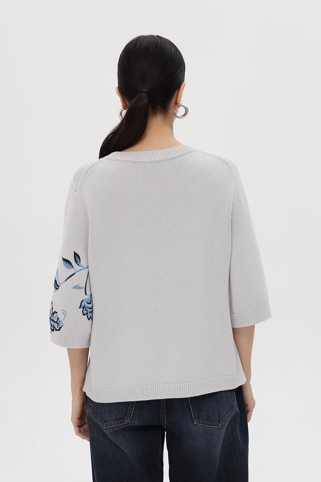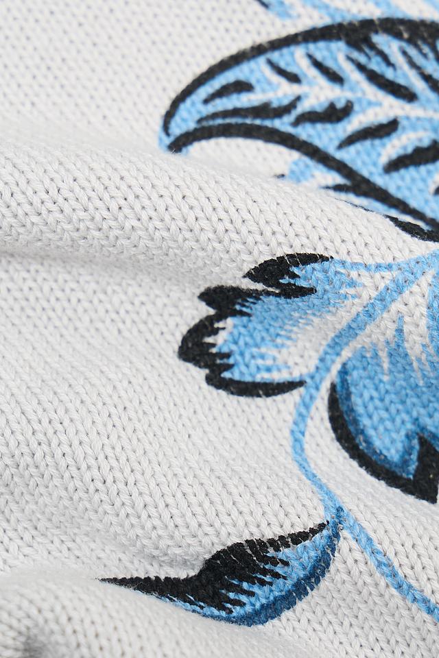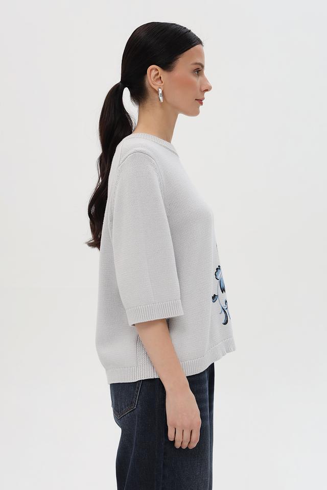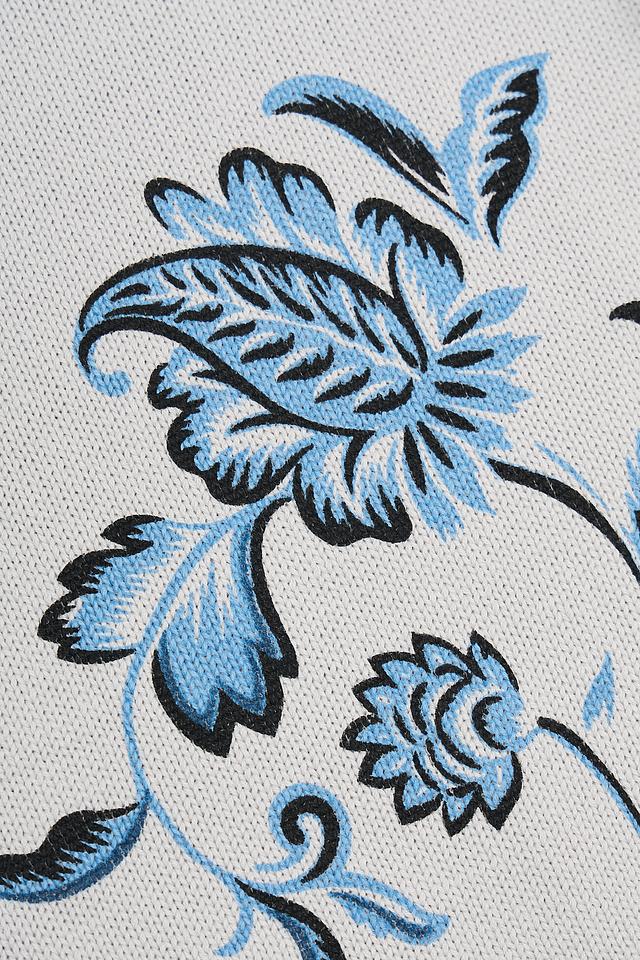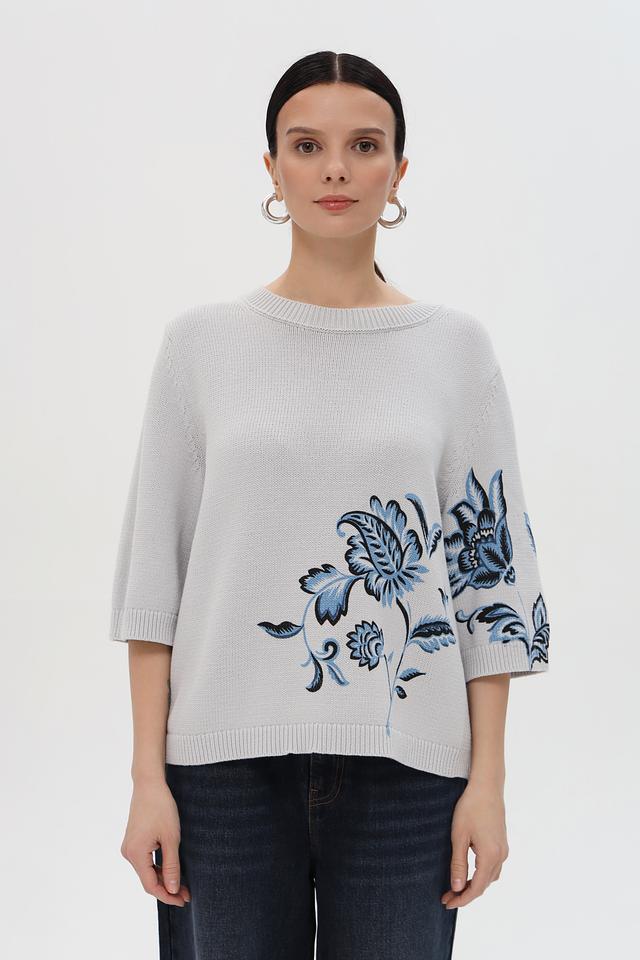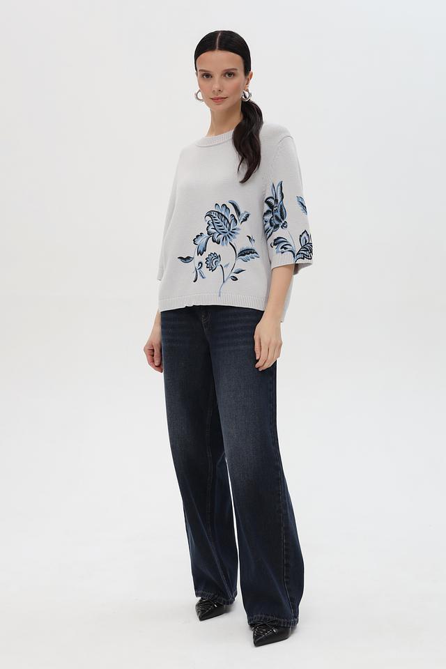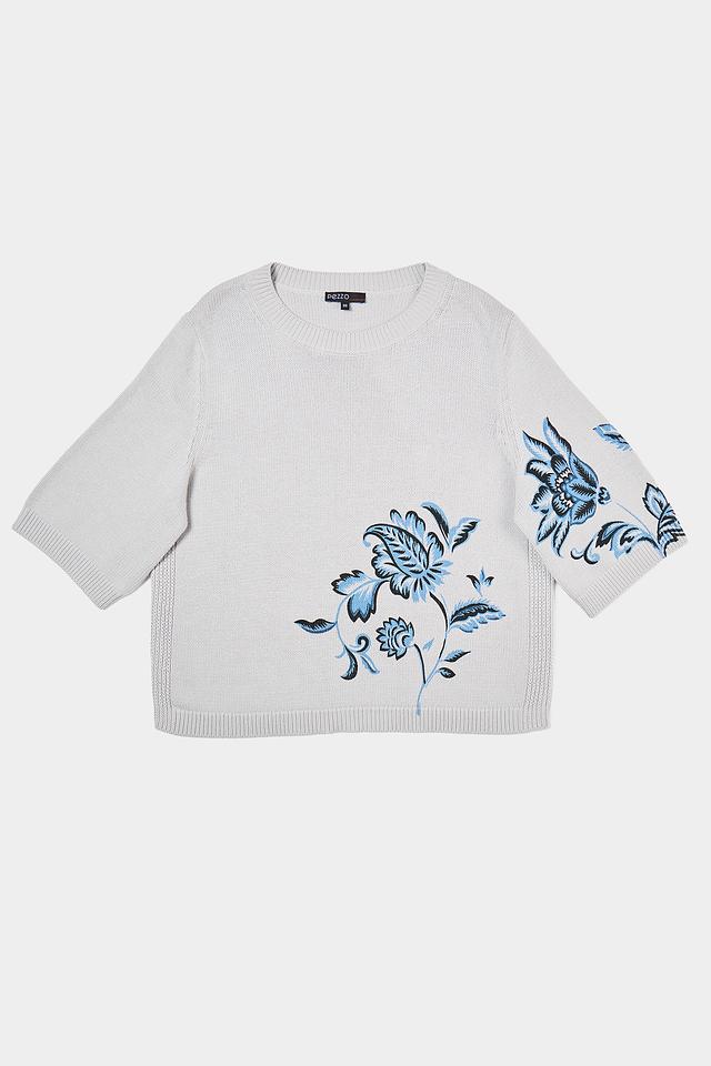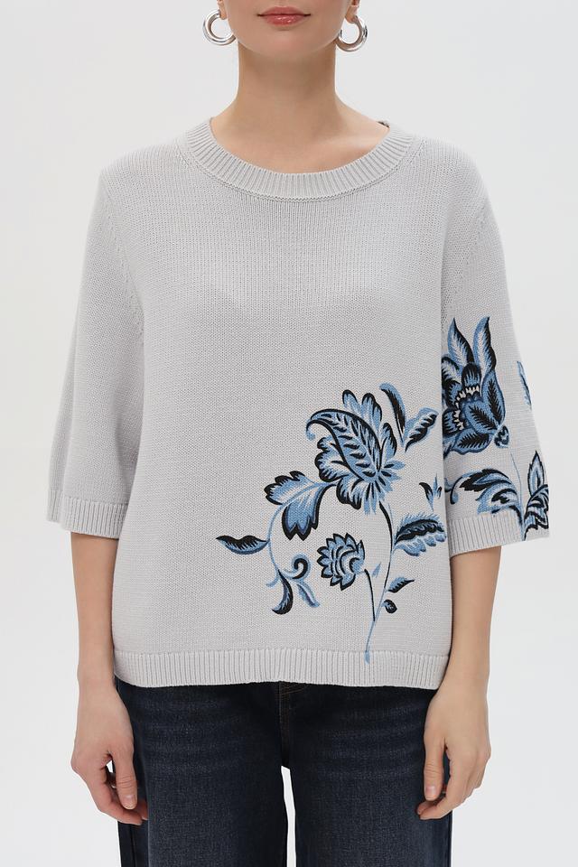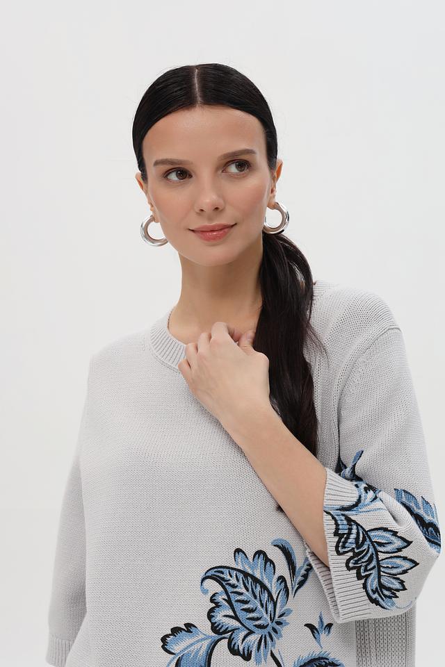 Пуловер имеет светло-серый цвет, который служит отличным фоном для яркого цветочного принта. Рисунок выполнен в синих и голубых оттенках, добавляя изделию свежесть и оригинальность.