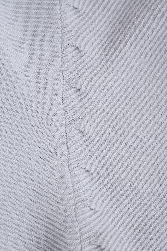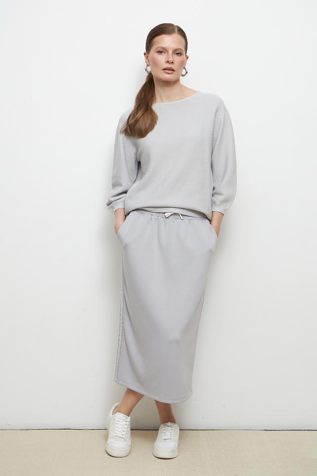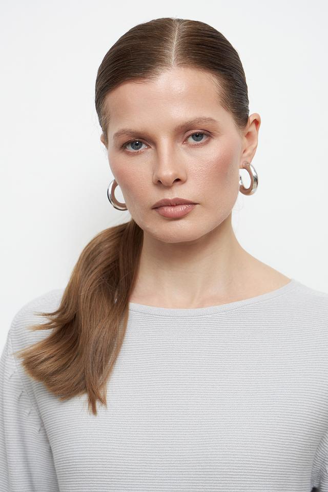 Этот стильный пуловер от Pezzo выполнен в сером цвете и имеет оригинальную полосатую текстуру. Модель с округлым вырезом горловины и рукавами три четверти, которые слегка расклешены к низу, создают женственный и элегантный силуэт.