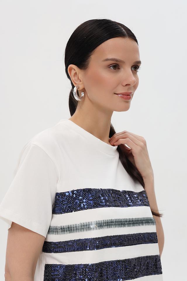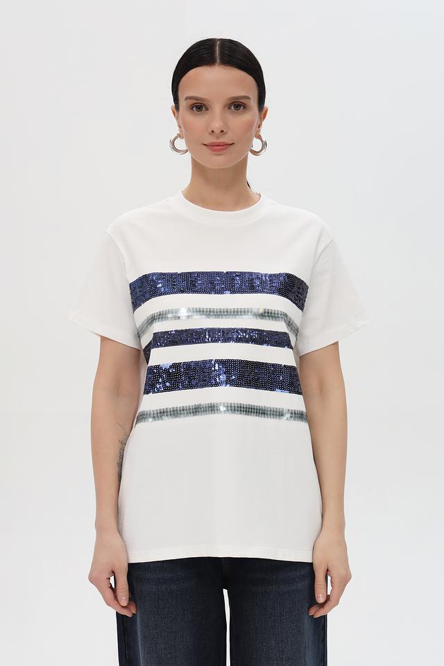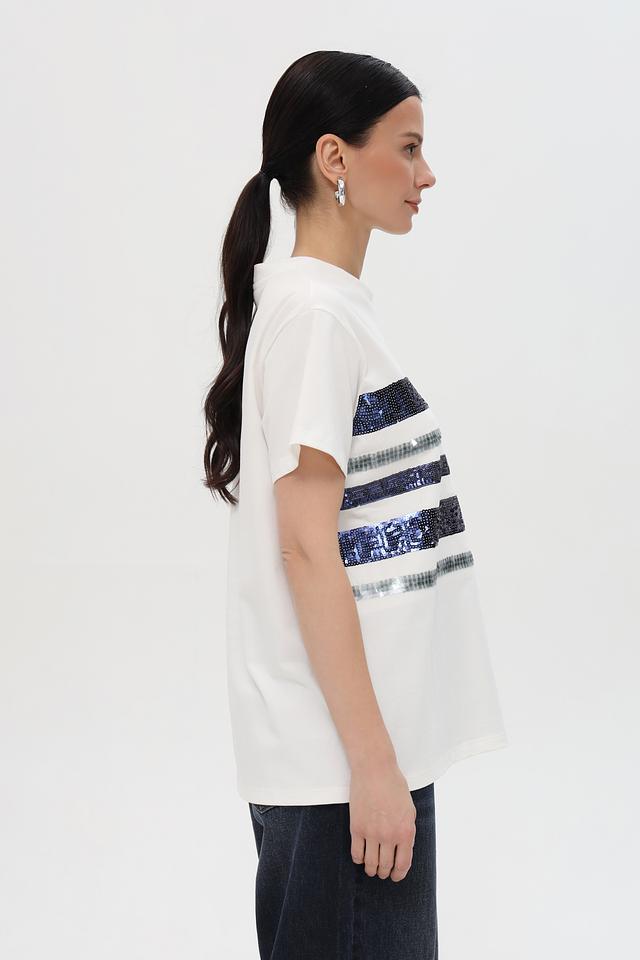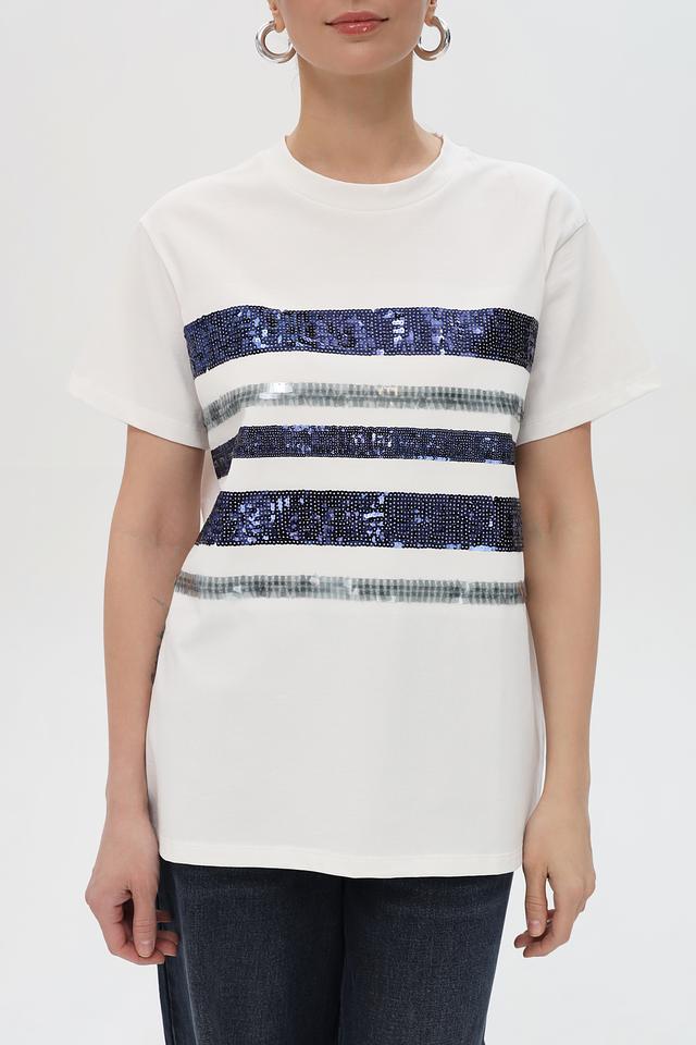 Основной цвет футболки – белый, что делает ее универсальной и легко сочетаемой с другими элементами одежды. Декоративные полоски в синих и серых тонах придают ей оригинальность и динамичный вид.