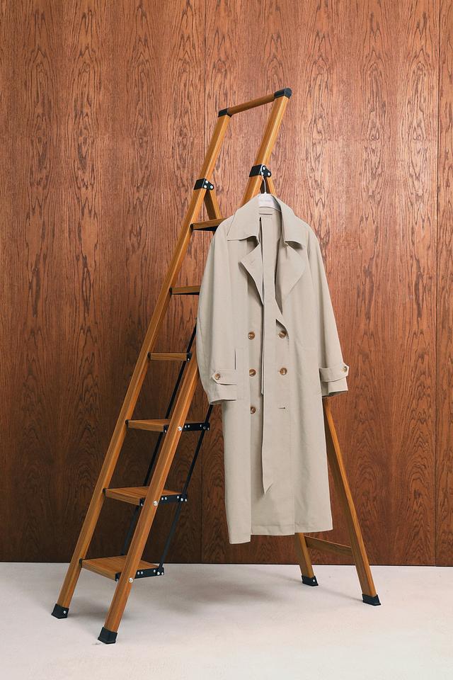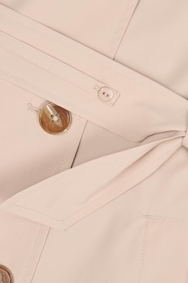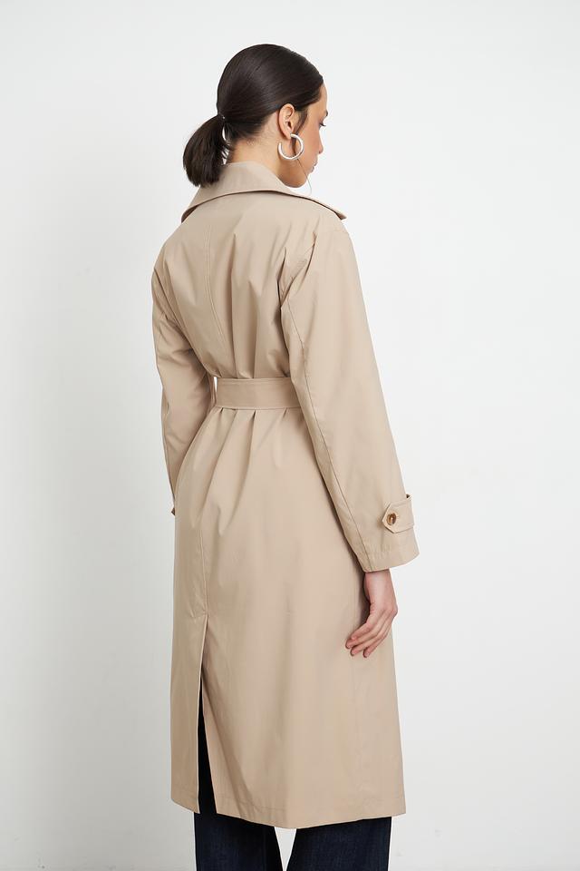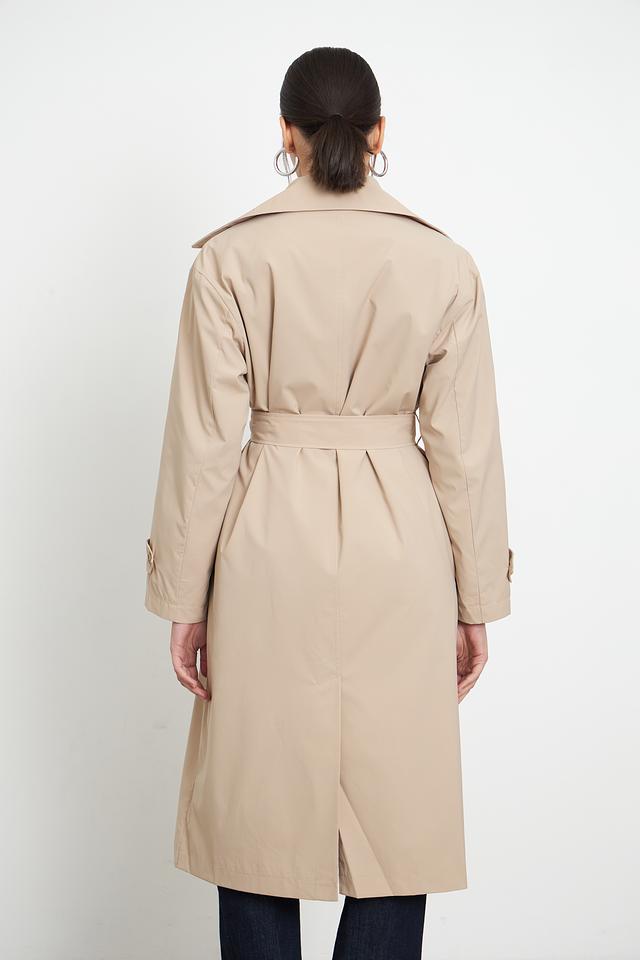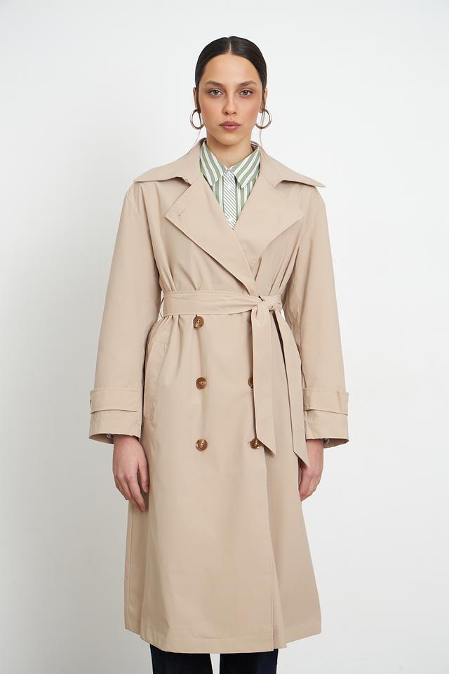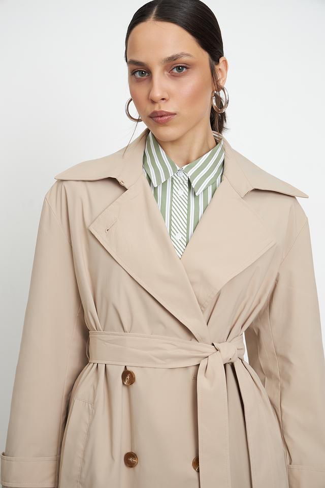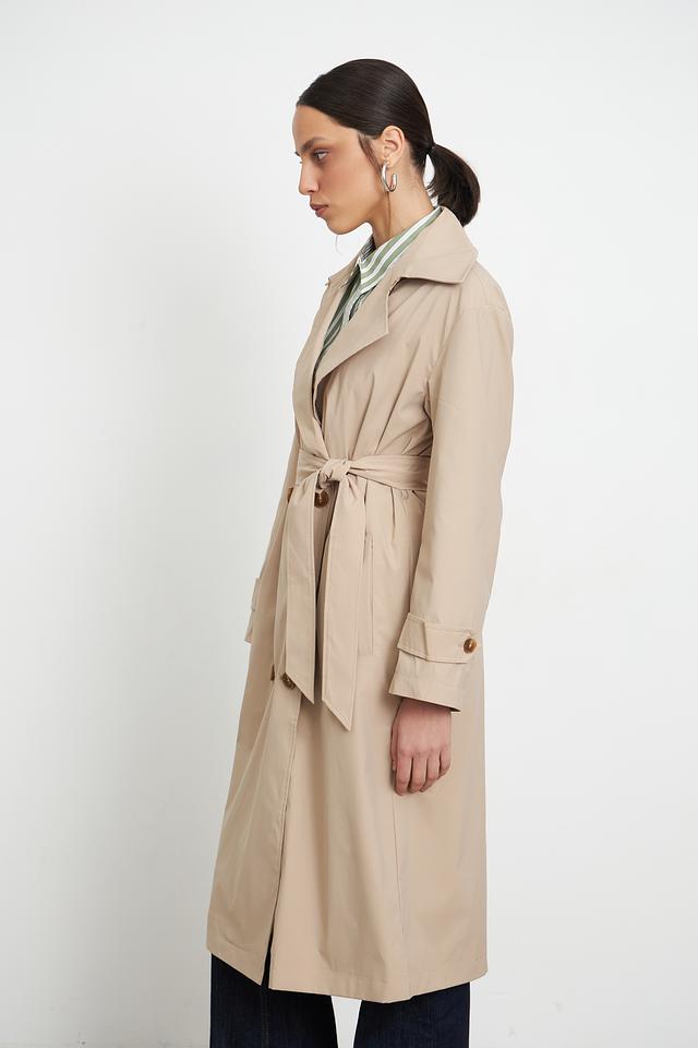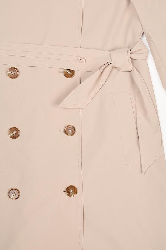 Плащ имеет двубортную застёжку на пуговицах, которые выполнены в тон изделия. Пояс позволяет подчеркнуть талию и создать более женственный силуэт. Воротник плаща отложной.