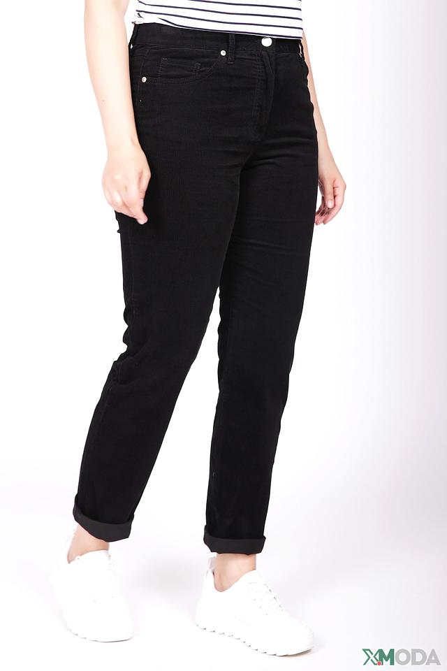 Брюки имеют классический чёрный цвет, который легко сочетается с различными элементами гардероба. Зауженный крой визуально стройнит фигуру, а манжеты добавляют образу непринуждённости и стиля.