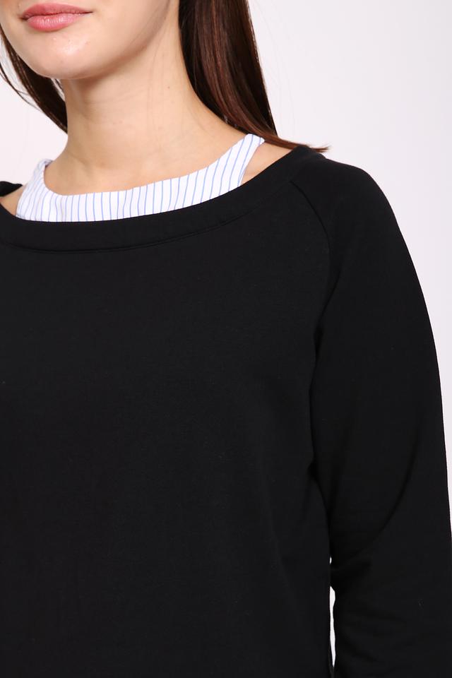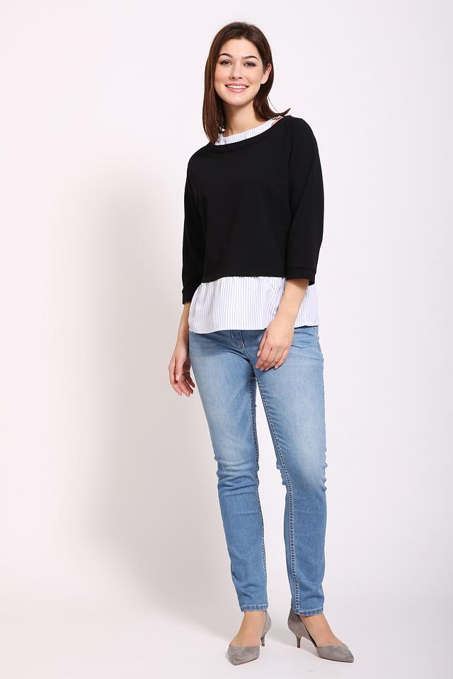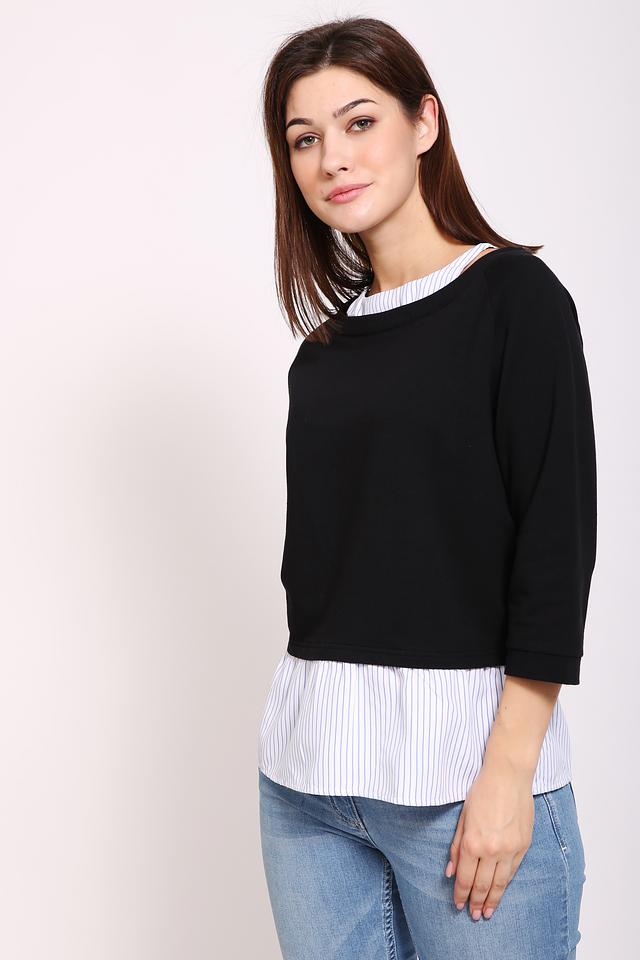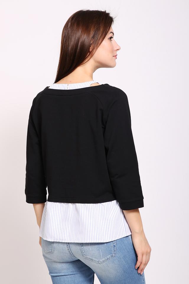 Чёрный пуловер Pezzo с оригинальным дизайном, сочетающим в себе гладкую текстуру и вставку в виде рубашки в белую полоску. Модель выполнена из мягкого хлопка с добавлением эластана для комфорта и хорошей посадки. Состав: хлопок 95%, эластан 5%