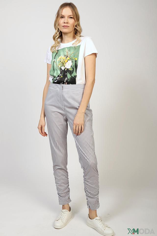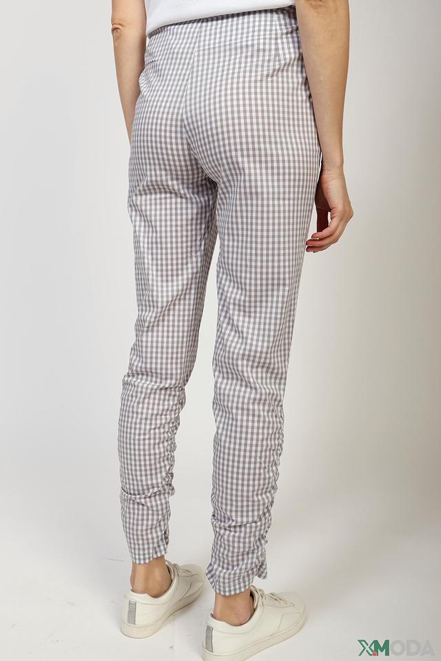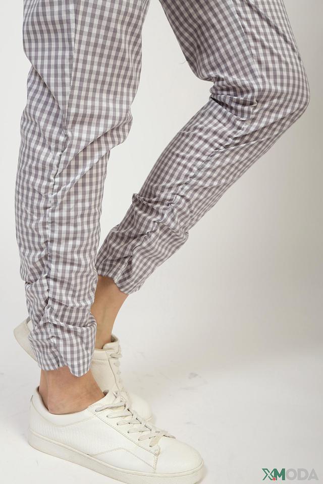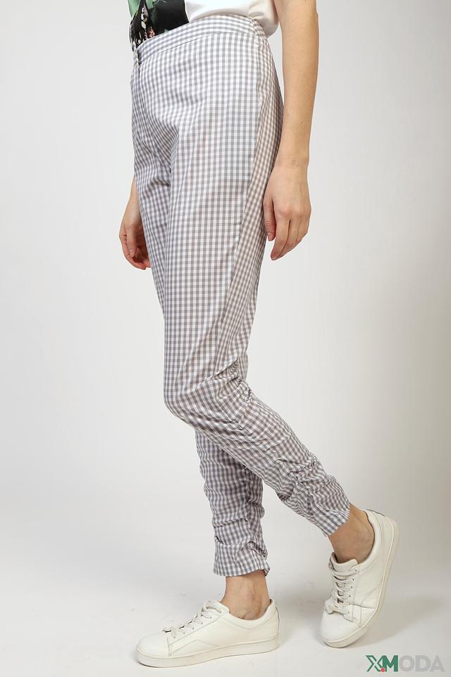 Основной цвет брюк – серый, а рисунок – клетка, выполненная в сочетании серого и белого цветов. Ткань состоит из хлопка (73%), полиэстера (25%) и эластана (2%), что обеспечивает комфорт и удобство при носке.