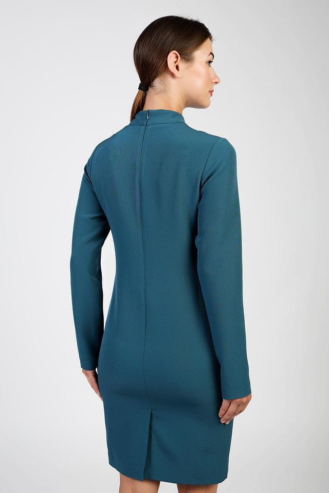 Платье имеет длинные рукава и высокий воротник-стойку, что придает ему сдержанную элегантность. Застежка-молния расположена сзади, обеспечивая удобство при надевании. Ткань платья – это сочетание полиэстера (96%) и спандекса (4%), что гарантирует комфорт в носке и легкий уход.