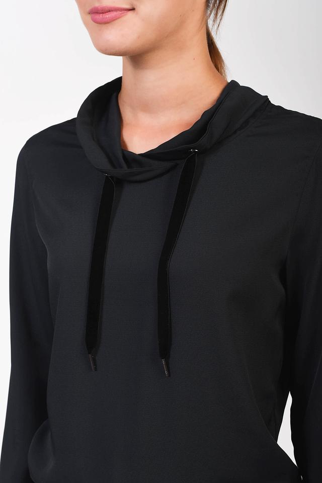Чёрная блуза Pezzo с капюшоном и шнурками – стильное и удобное решение для создания повседневных образов. Изготовлена из гладкой ткани на основе полиэстера, обеспечивающей комфорт в носке. Состав: полиэстер 100%