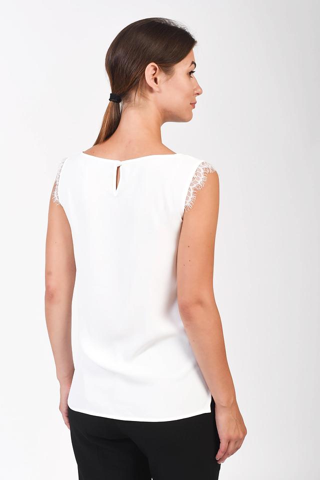 Блуза имеет прямой крой и V-образный вырез, который визуально удлиняет шею и делает силуэт более изящным. Отличительной особенностью модели является кружевная отделка на плечах и горловине, придающая ей романтичный и женственный вид.