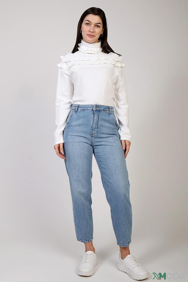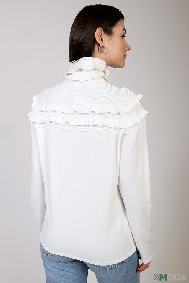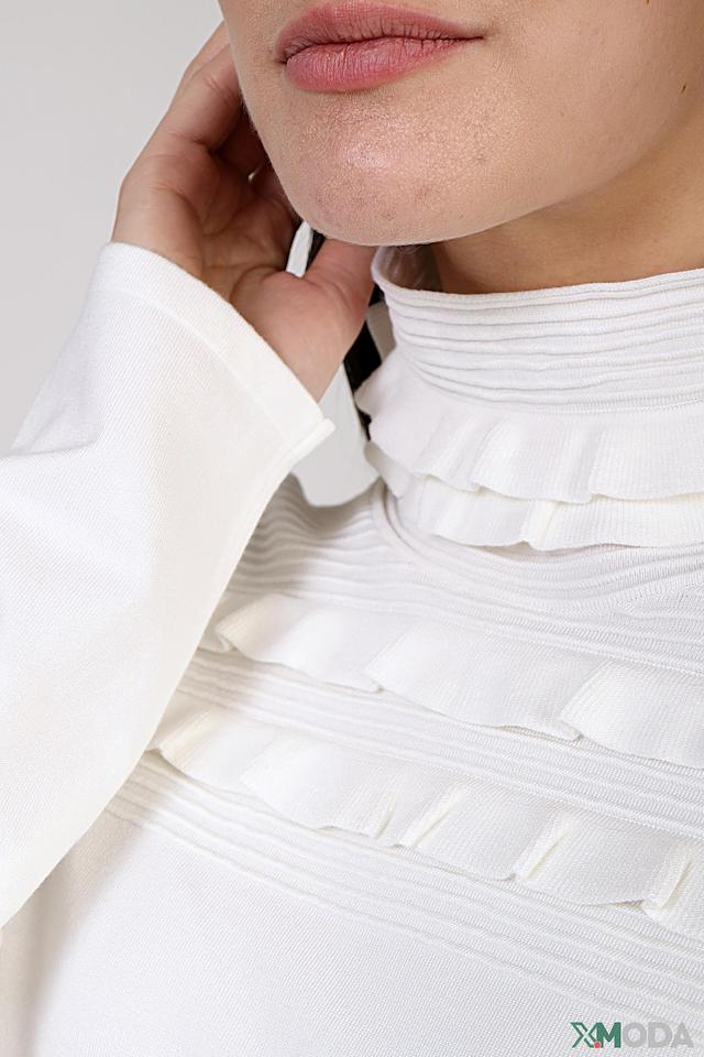 Особенностью модели является декор в виде рюшей на горловине и верхней части переда, что придает ей женственность и изысканность. Водолазка имеет длинные рукава и облегающий силуэт, подчеркивающий фигуру.