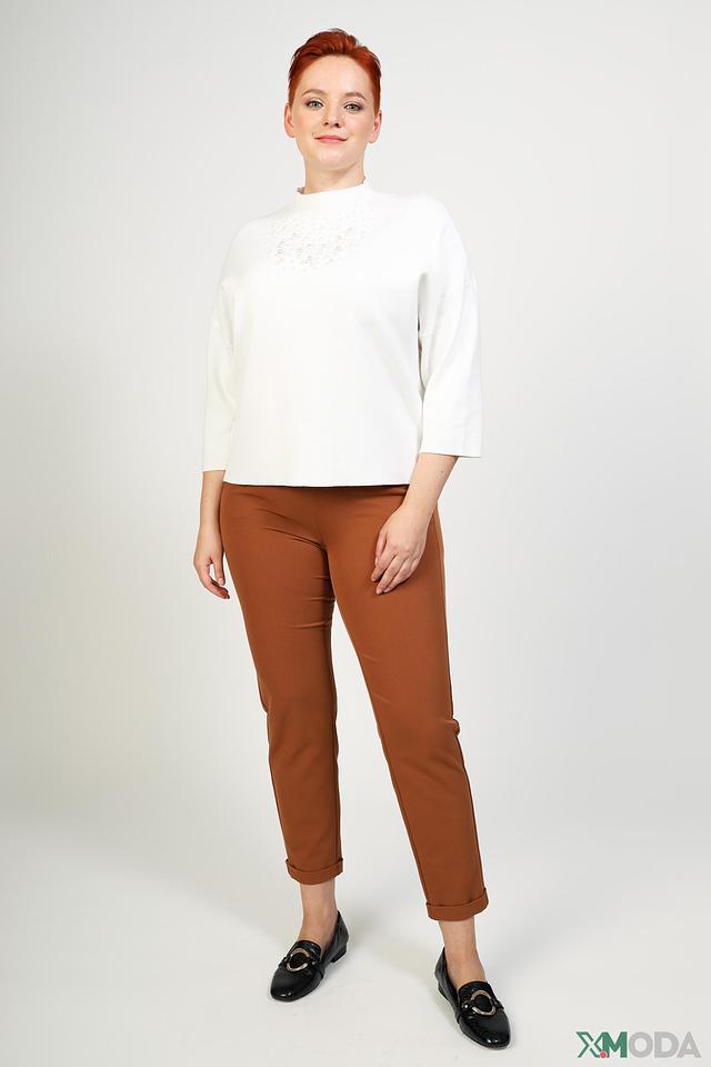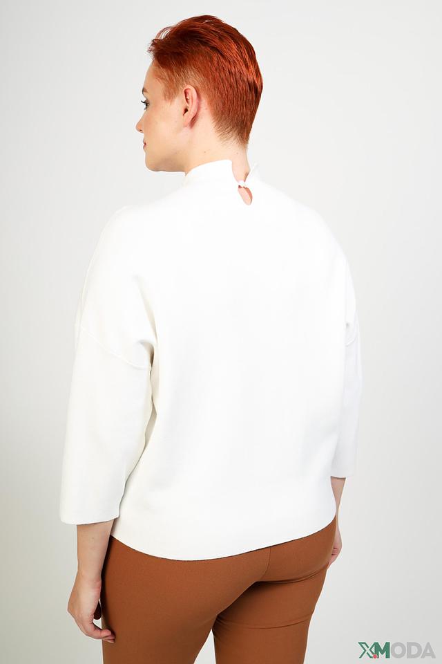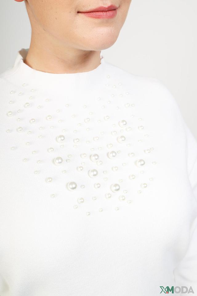 Модель отличается свободным кроем и рукавами 3/4, что делает ее удобной и универсальной. Особый акцент в дизайне пуловера – деликатный декор из жемчужных бусин, расположенных в верхней части изделия.