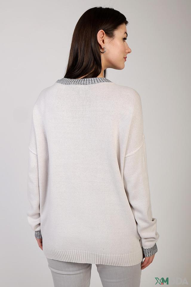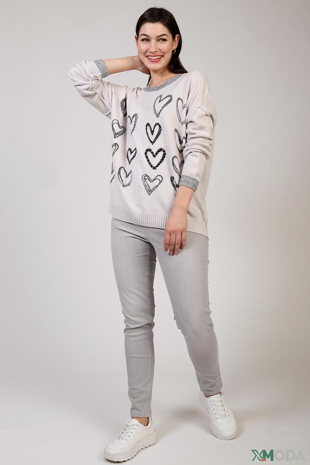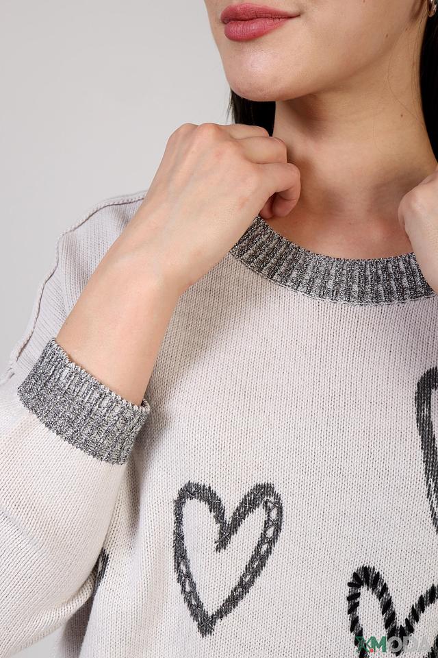 Пуловер имеет свободный крой, который обеспечивает комфорт в носке. Декорирован принтом в виде чёрных сердечек, расположенных по всей поверхности изделия. Манжеты и горловина отделаны блестящей нитью, что придает пуловеру изысканность.