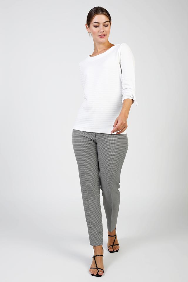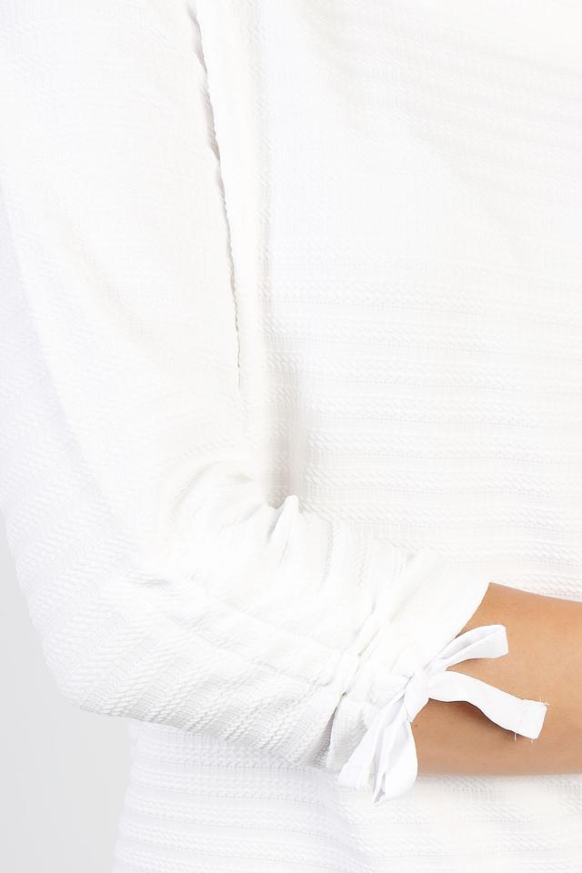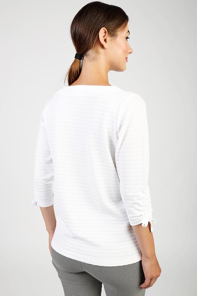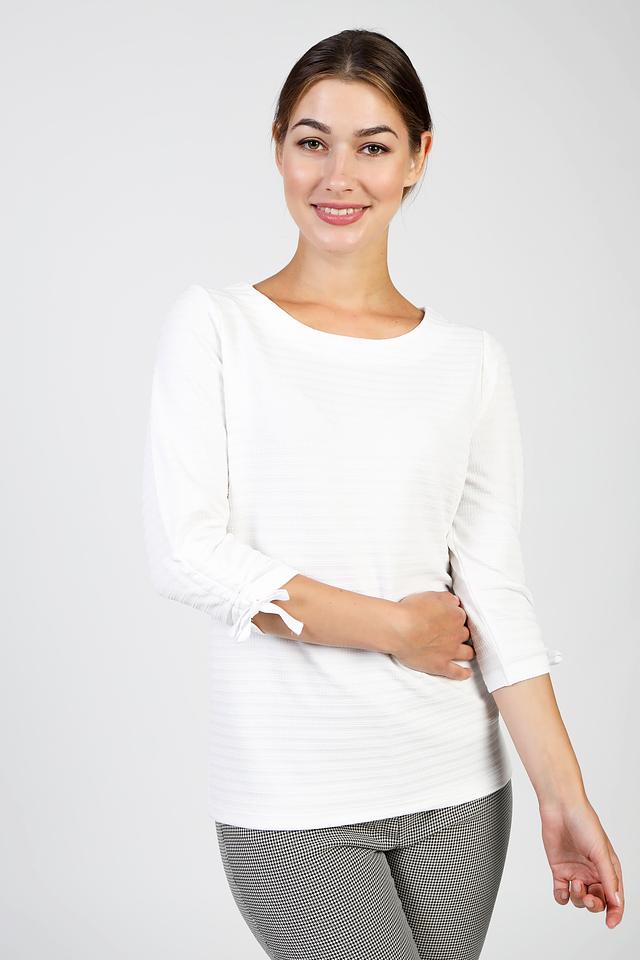 Белый пуловер Pezzo с рукавами 3/4 и завязками на манжетах. Изготовлен из текстурированной ткани, что придает ему особый шарм. Идеально дополнит ваш повседневный образ. Состав: полиэстер 98%, спандекс 2%