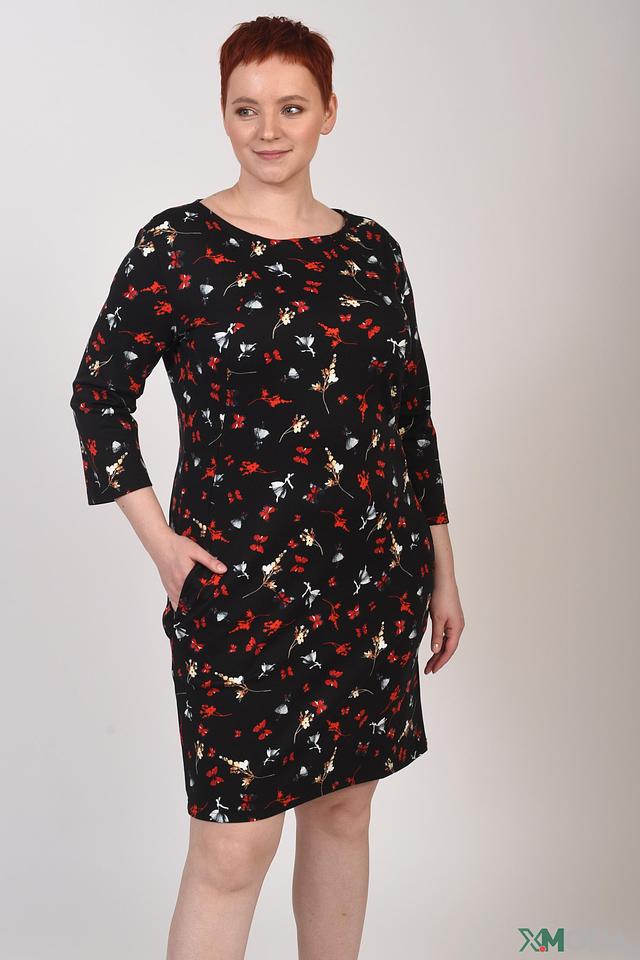 Платье имеет прямой силуэт, длину до колена и удобные рукава 3/4. Вырез горловины округлый, а на спине предусмотрен небольшой вырез, добавляющий образу лёгкости и изящества. Боковые швы платья имеют небольшие карманы.