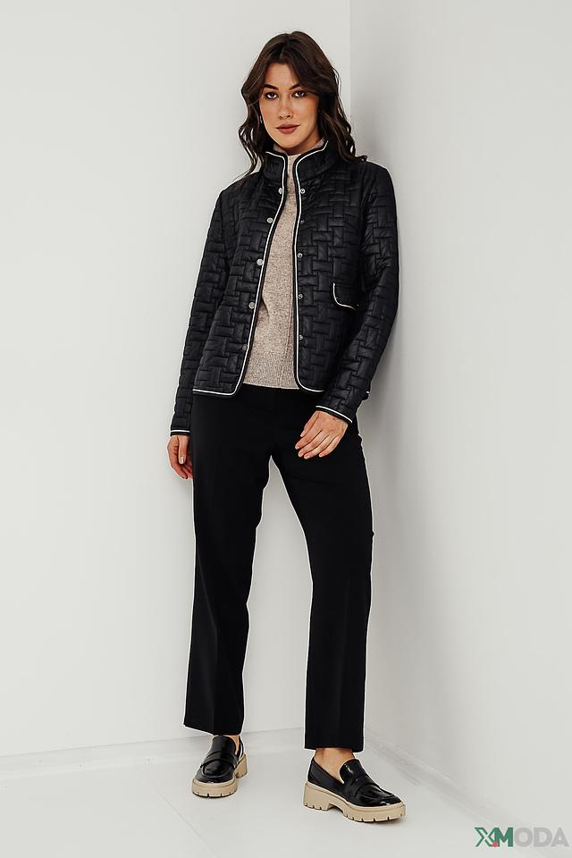 Модель имеет классический крой с воротником-стойкой и застежкой на пуговицы. Белая отделка по краям придает жакету элегантный вид. Боковые карманы обеспечивают функциональность и удобство.