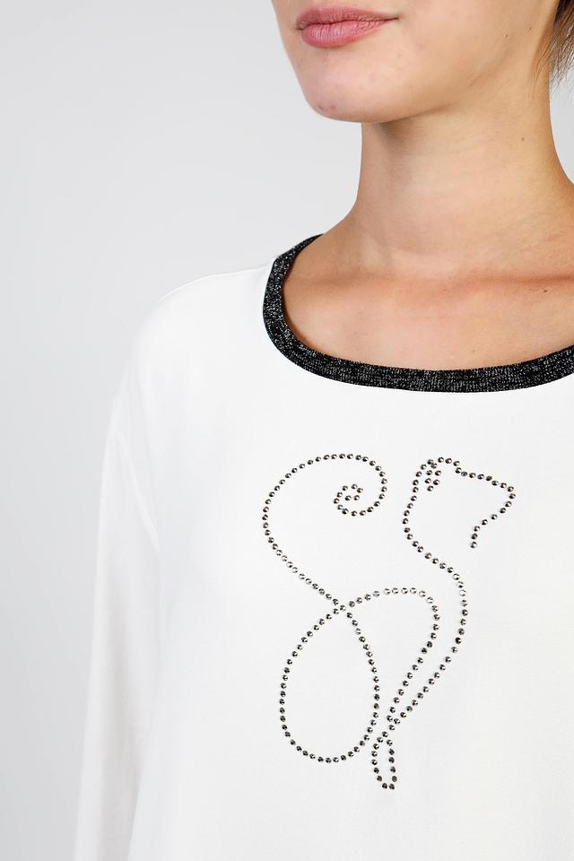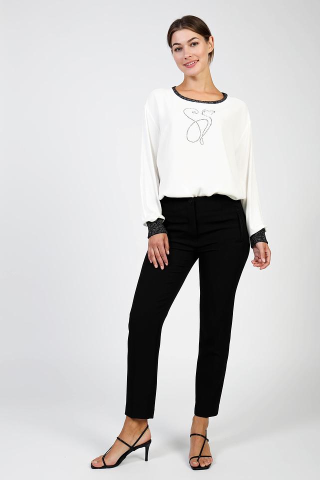 Основной акцент модели – вышивка в виде силуэта лисы, выполненная аккуратными стежками. Горловина и манжеты рукавов декорированы чёрной отделкой с блестками, что добавляет блузе изысканности.