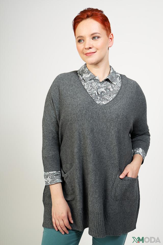 V-образный вырез горловины делает образ более женственным и позволяет сочетать пуловер с различными блузками и топами. Накладные карманы добавляют функциональности и непринужденности.