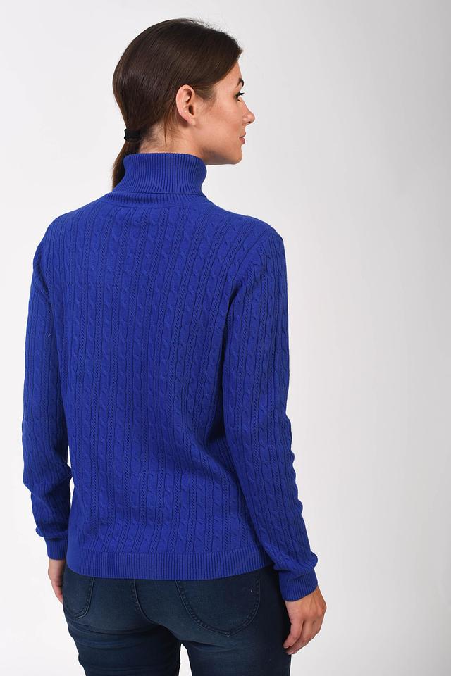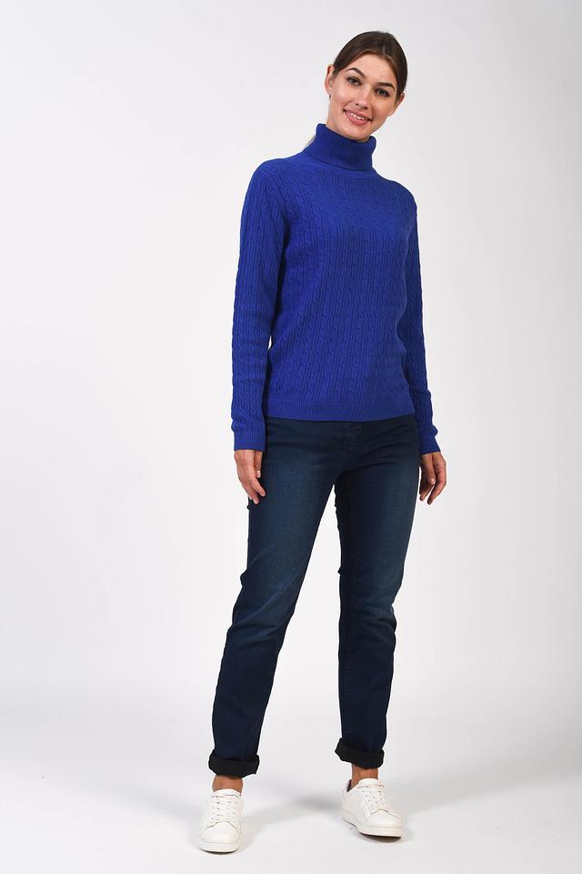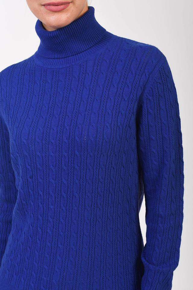 Синий цвет пуловера универсален и легко сочетается с различными элементами одежды. Фактурная вязка косами добавляет изделию объём и оригинальность. Высокий воротник защищает от ветра и холода, а также позволяет создавать стильные образы.