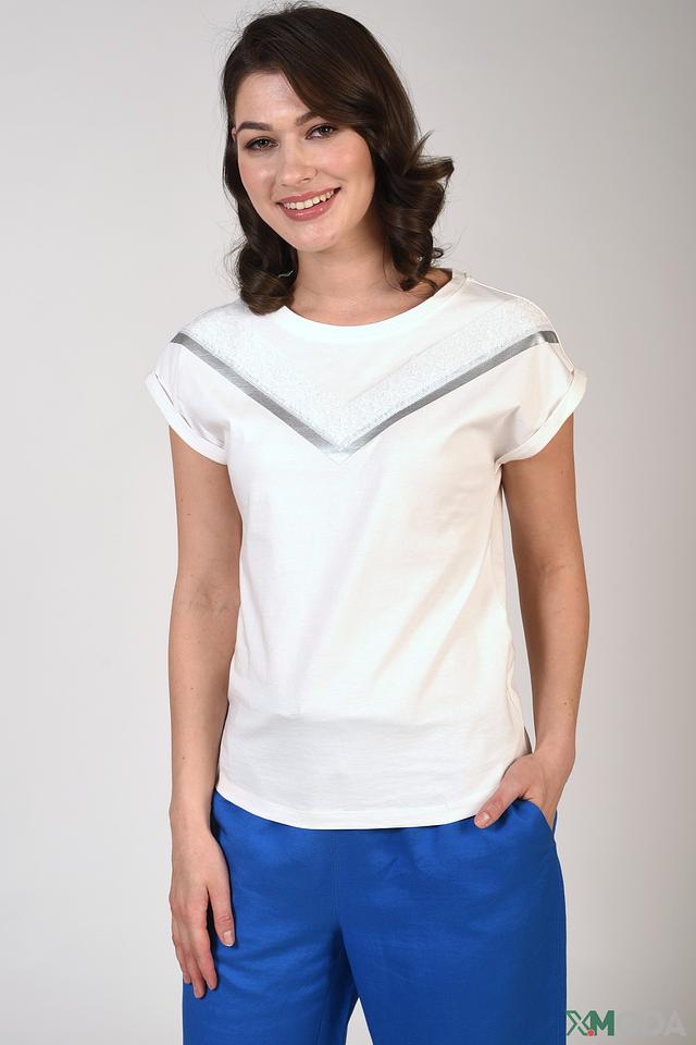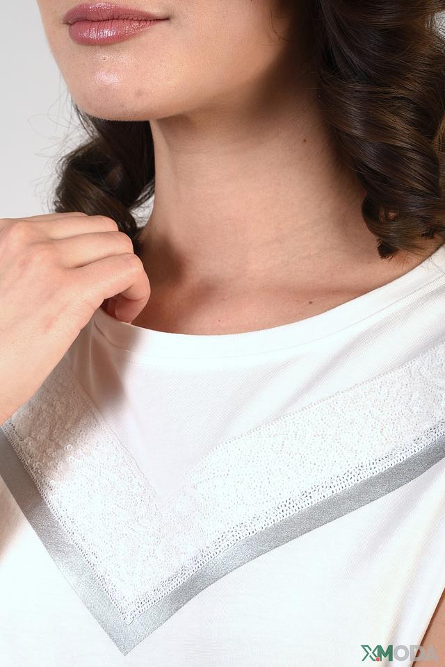 Особенностью данной модели является декоративная полоса из серебряной ткани, расположенная на вырезе горловины, что придает ей изысканность и оригинальность. Короткие рукава с аккуратными манжетами делают футболку удобной для повседневной носки.