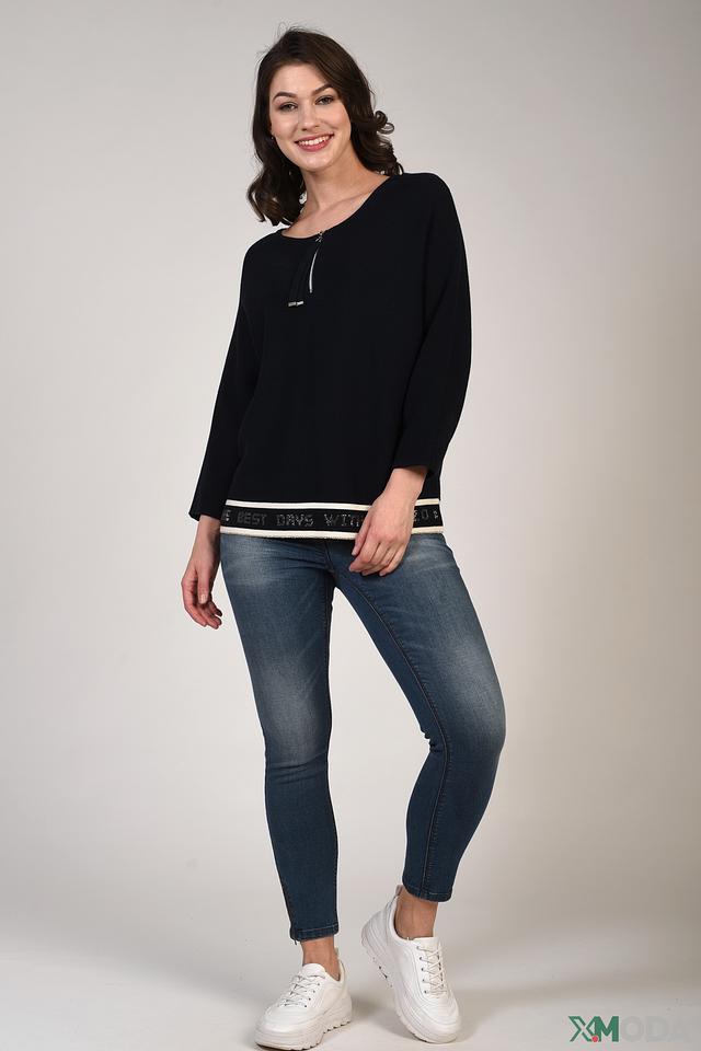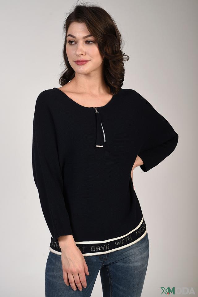 Пуловер имеет V-образный вырез, который визуально удлиняет шею и делает силуэт более изящным. Декоративная молния добавляет изделию оригинальности и позволяет регулировать глубину выреза.