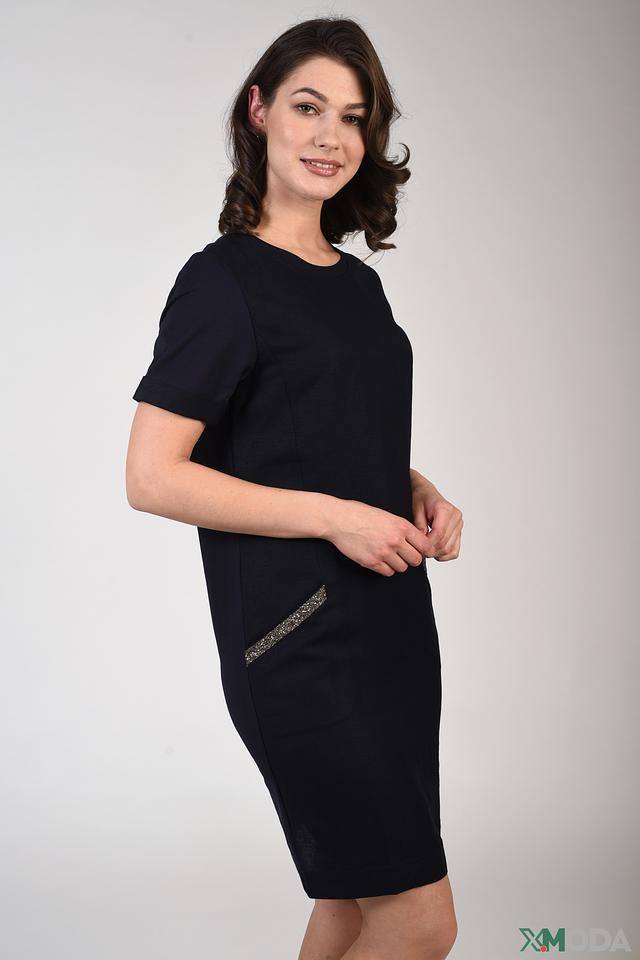 Модель имеет приталенный силуэт, который подчеркивает фигуру, и короткие рукава, обеспечивающие комфорт в теплую погоду. На передней части платья расположены декоративные карманы, которые придают ему особый шарм и функциональность.